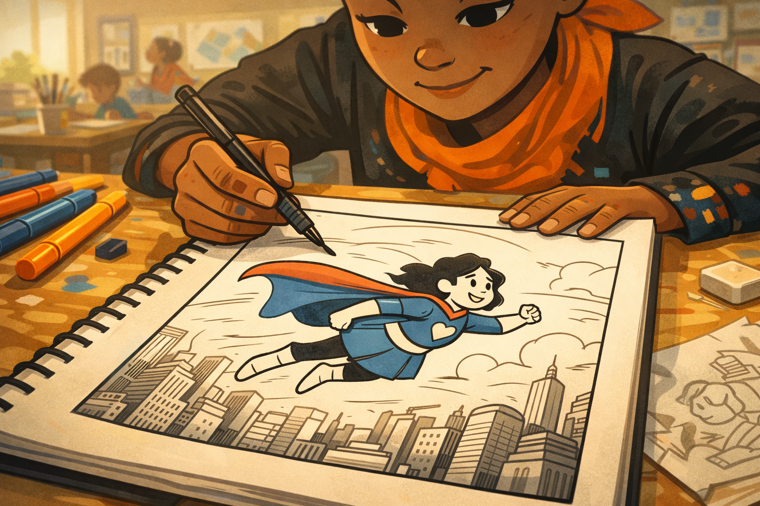 Maya has been working on this comic panel for three days. A girl superhero soaring over a city, cape streaming behind her, arms stretched wide. Maya draws every line by hand with a fine-tip pen. No tracing. No copying. Every line is hers.
