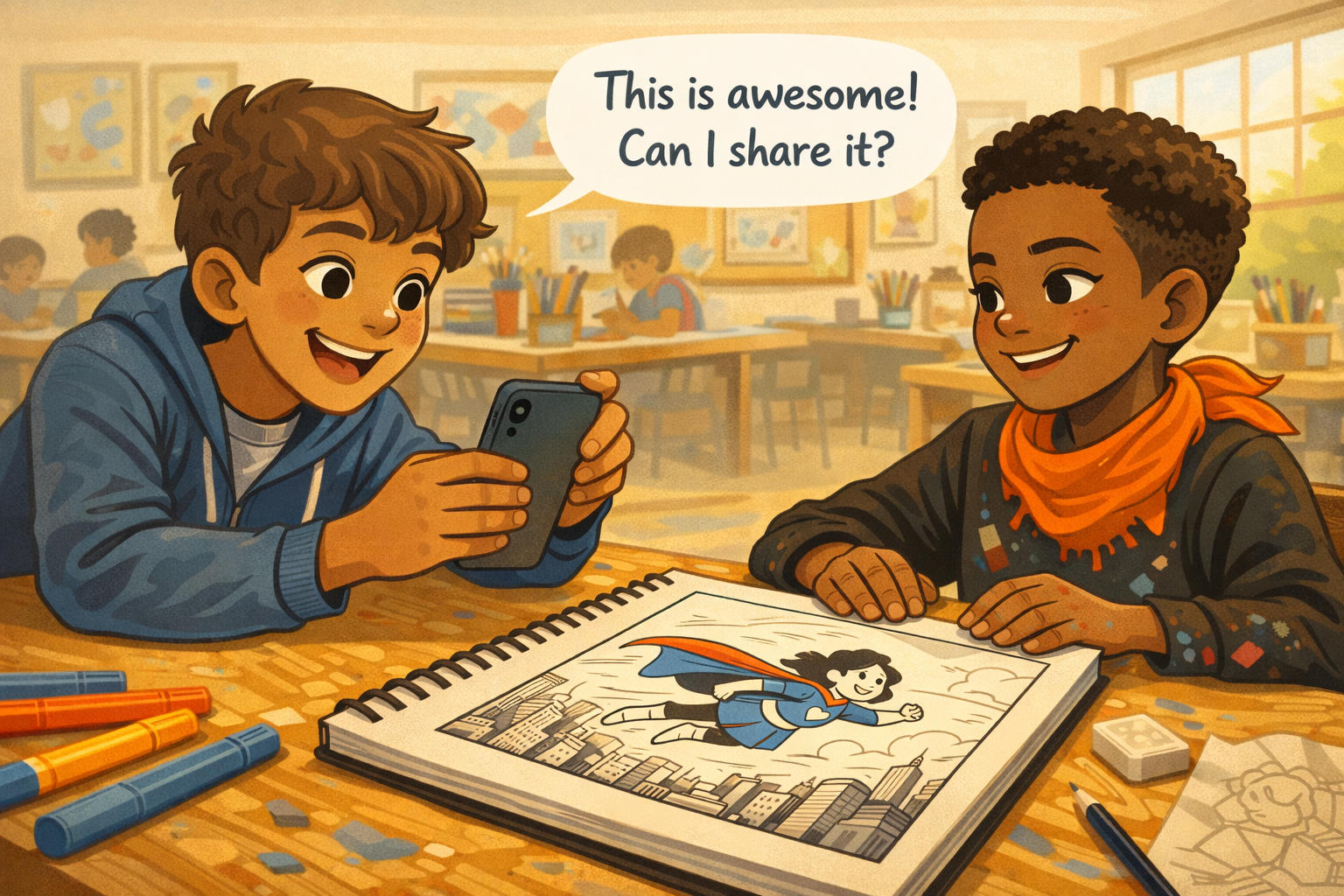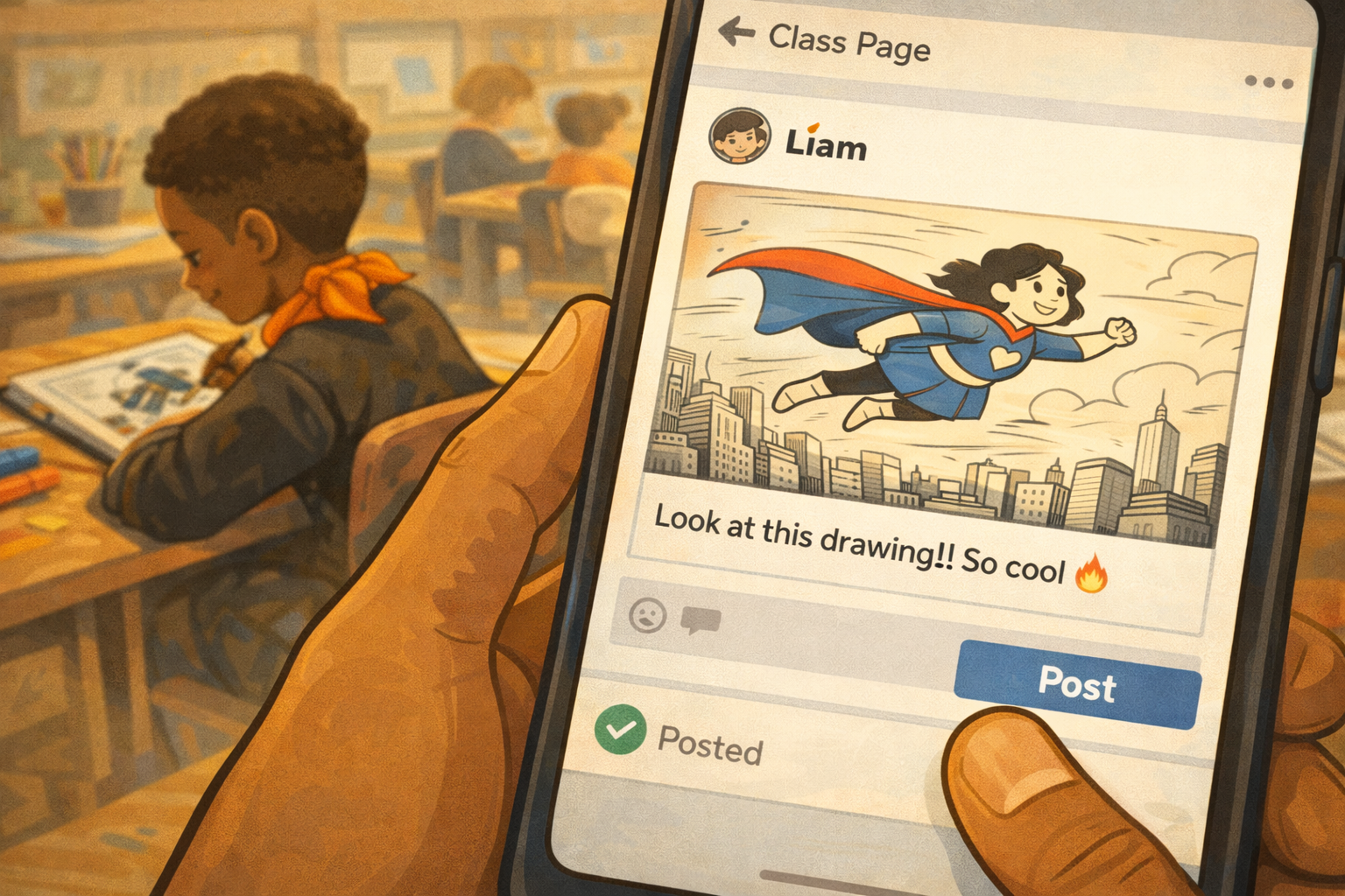 Liam posts the photo to the class page. He types a caption: "Look at this drawing!! So cool." He hits post. He is excited. He wants everyone to see it.