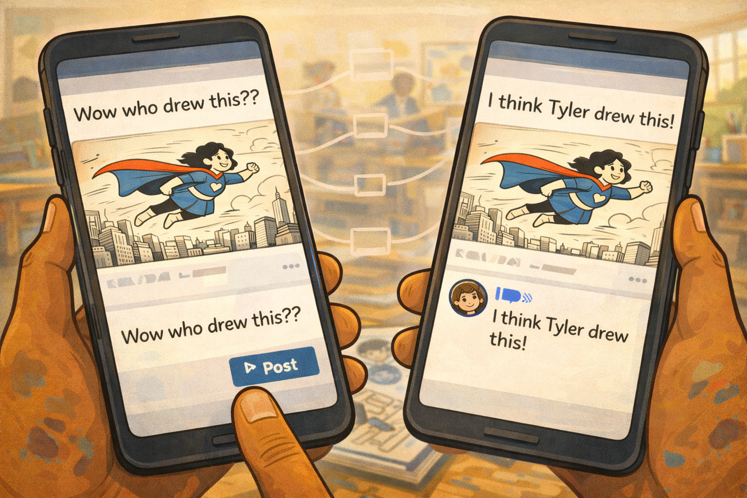 The post spreads. Kids share it. Kids comment on it. Someone writes, "Wow, who drew this??" And then, under the post, another comment: "I think Tyler drew this."