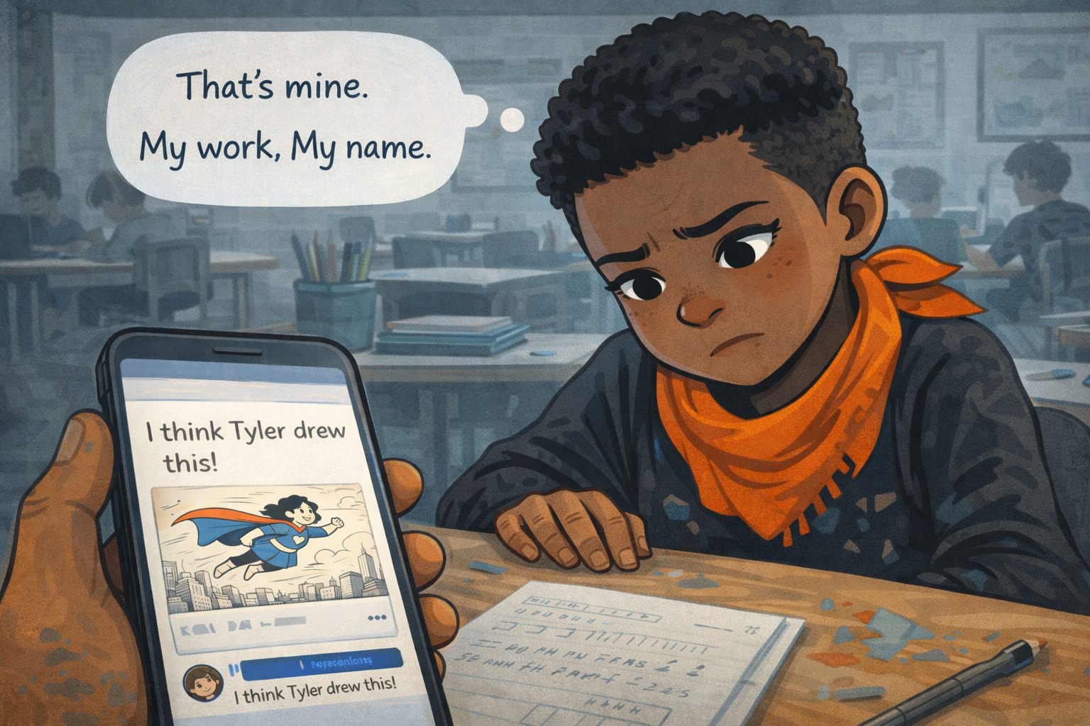 Maya finds out during math class. A friend shows her the post on their phone. Maya sees her drawing — the superhero she spent three days on, every line drawn by hand. She sees the comments. She sees Tyler's name where hers should be.