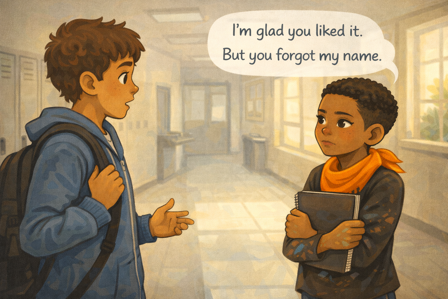 Maya finds Liam in the hallway after class. Her heart is beating fast, but she keeps her voice steady.