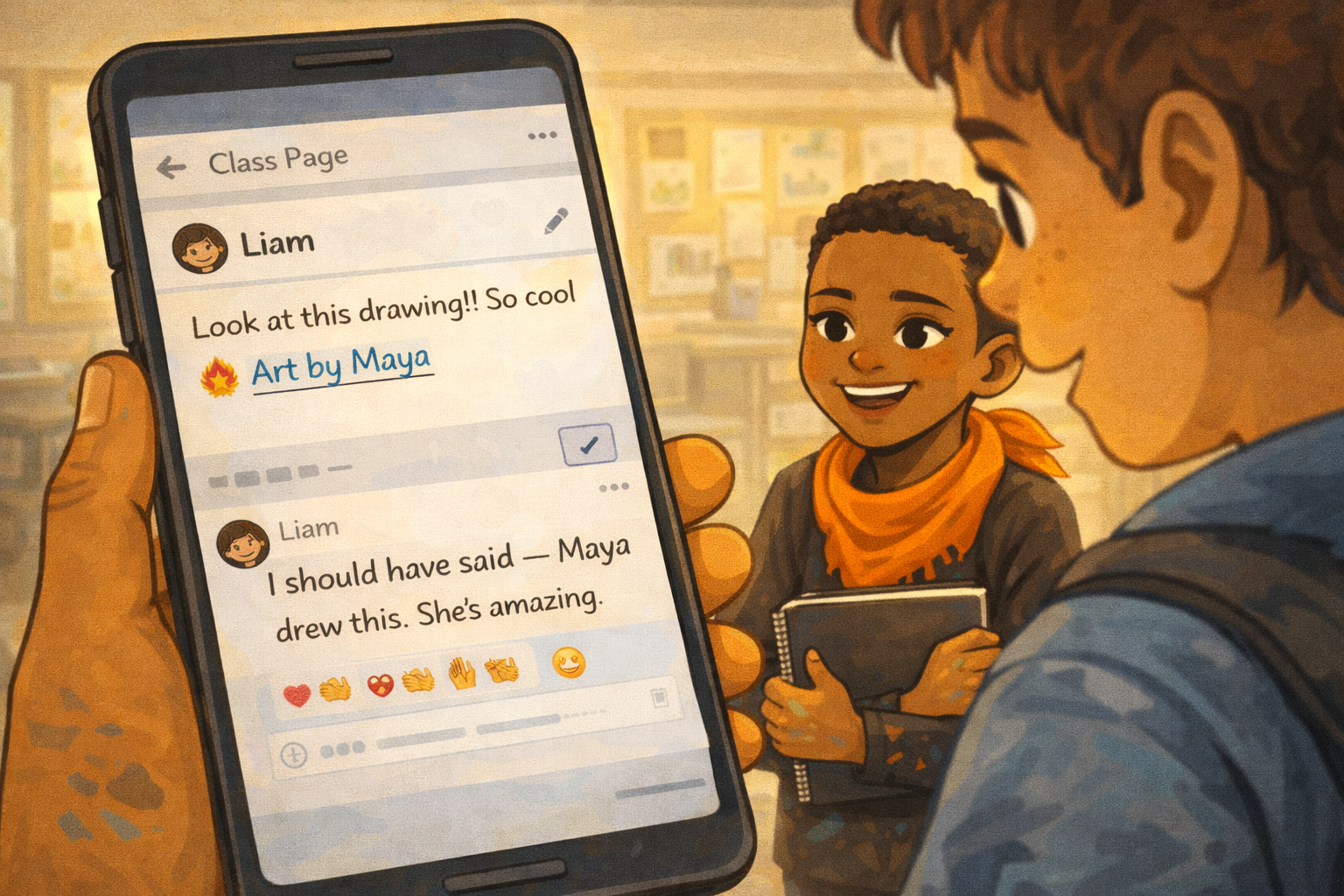 Liam pulls out his phone right there in the hallway. He edits the post. He adds three words to the caption: Art by Maya. Then he writes a comment: "I should have said — Maya drew this. She's amazing."