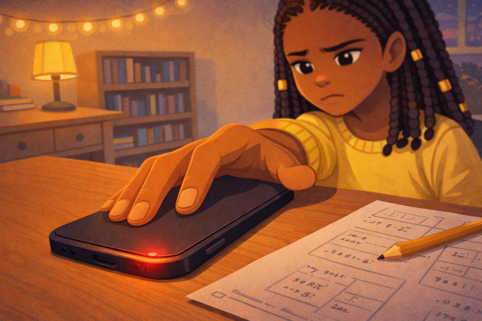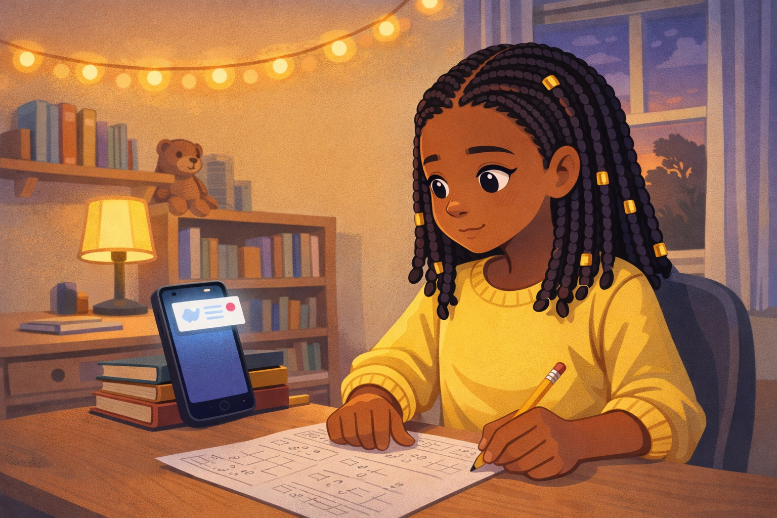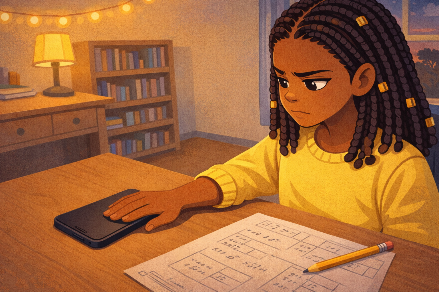 The messages keep buzzing. Nia's face tightens. She flips her phone face-down on the desk. She does not want to read any more. She tries to focus on her homework, but the numbers on the worksheet blur. Her brain keeps going back to the chat.