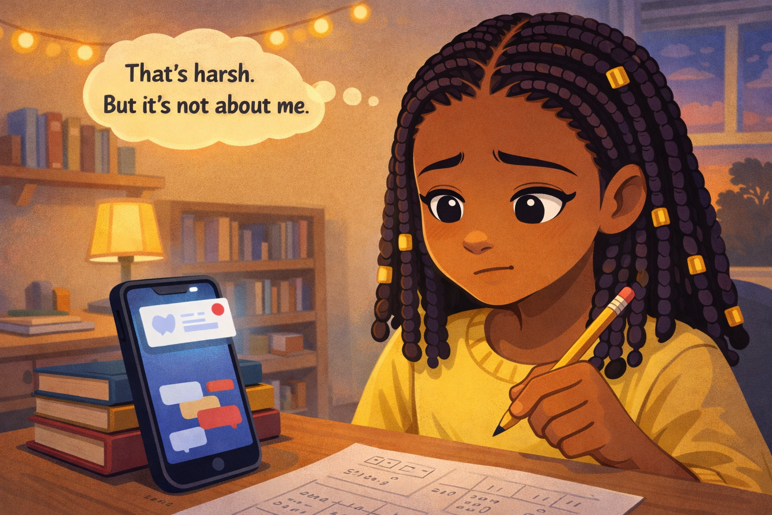 More messages come in. Other kids are adding on, making jokes. Nia reads them. She thinks: That's harsh. But it's not about me. She puts her pencil down, scrolls through the messages, and goes back to her homework. It is easier not to get involved.