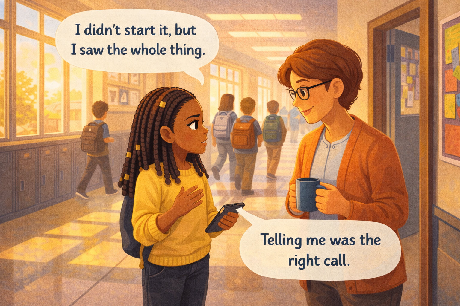 | Telling an adult | She showed the screenshot to her teacher | A trusted adult can do things a student cannot — and telling is never tattling |