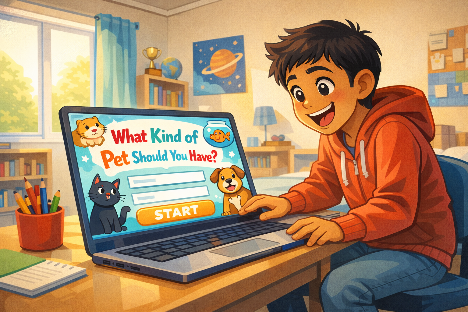 Noah finds a quiz online. The page is covered in bright colors and cute cartoon animals. "What Kind of Pet Should You Have?" it says in big playful letters. Noah grins. He loves animals. He clicks "Start."