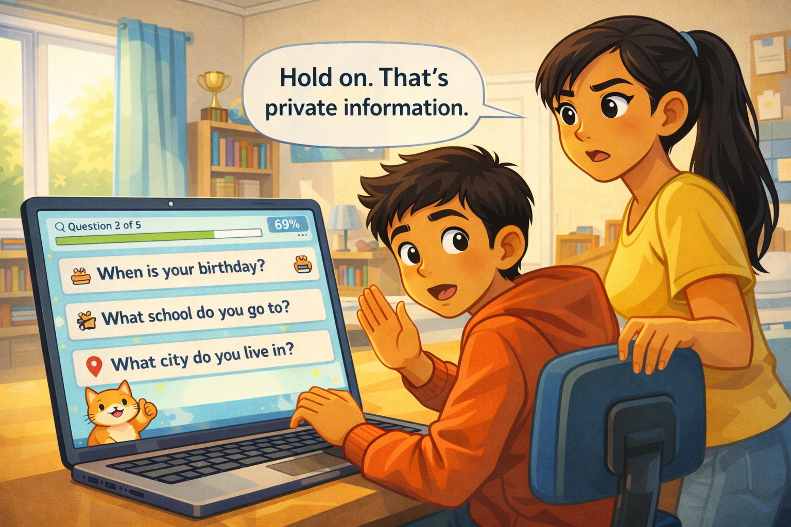 | The heavy questions | He almost typed his birthday, school, and city | Private information can be hidden inside "fun" questions |