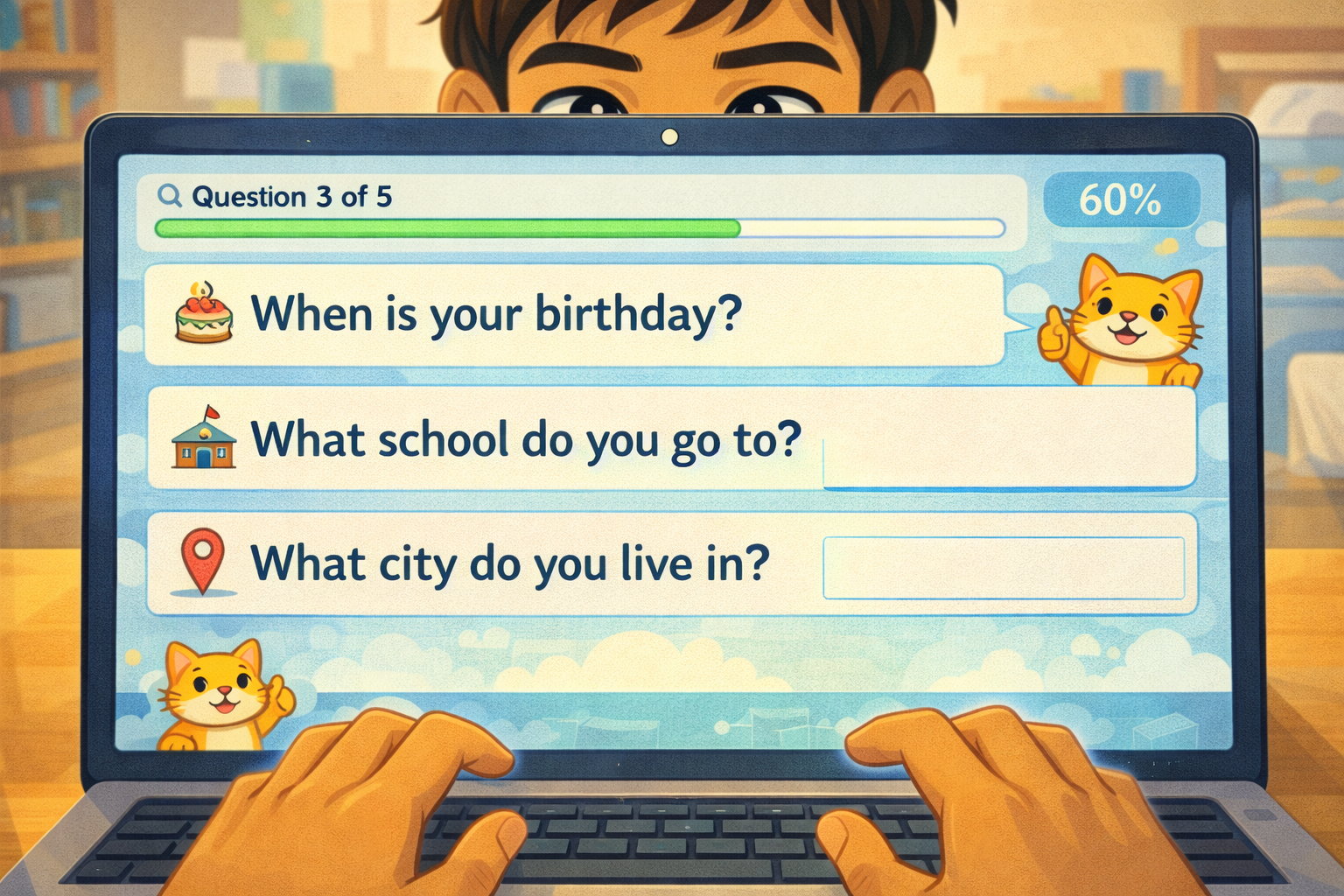 The next screen asks three more questions. "When is your birthday?" "What school do you go to?" "What city do you live in?" Noah starts typing. The quiz still looks fun. The cartoon cat is still smiling. Nothing looks wrong.