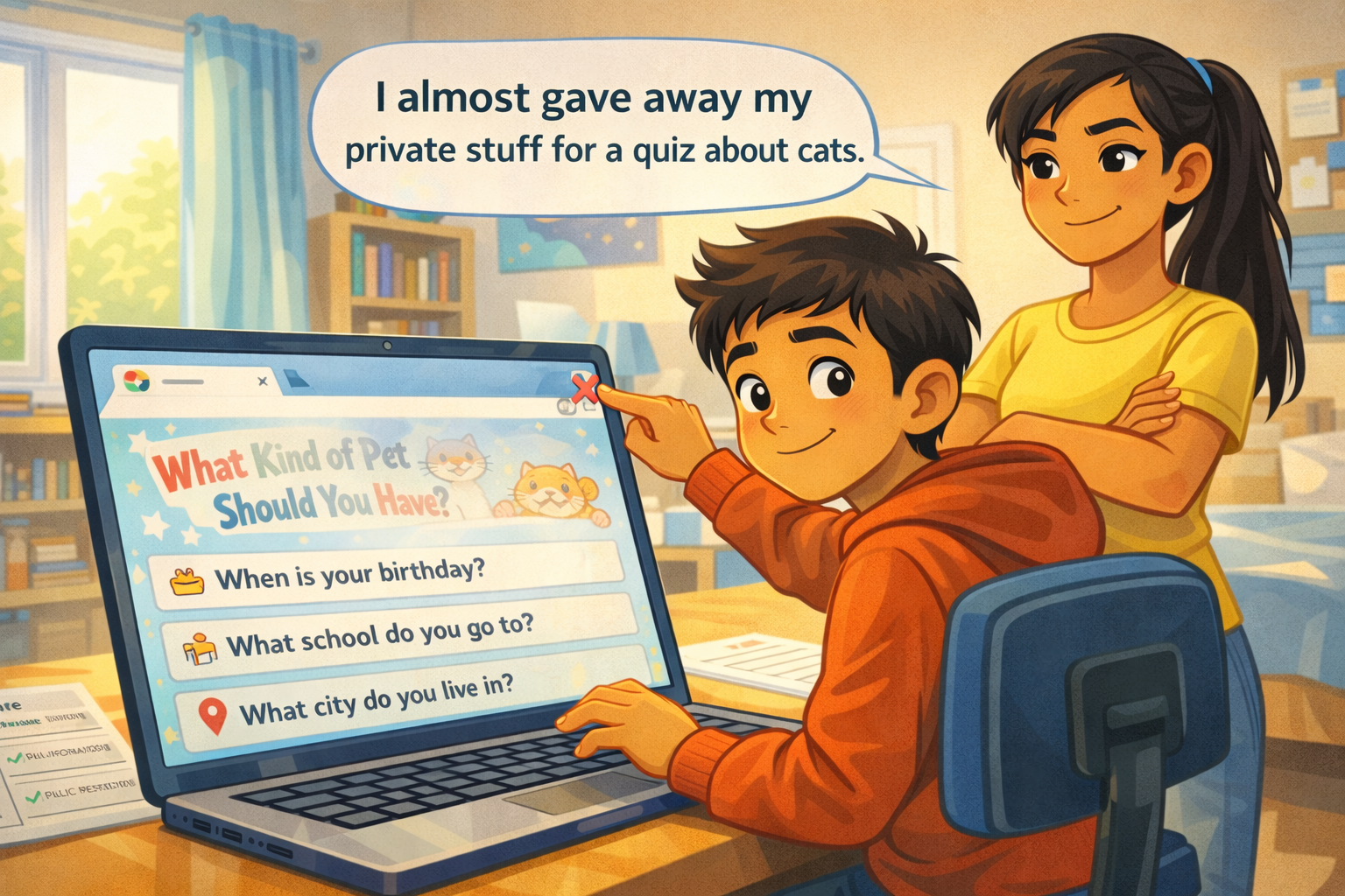 Noah is not careless. He is a smart, curious kid who saw something fun and jumped in. The quiz was designed to feel harmless. That is what made it tricky. What made Noah a digital citizen was pausing when his sister spoke up, learning the difference, and making a rule he can use forever.