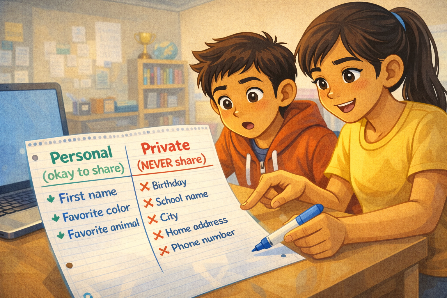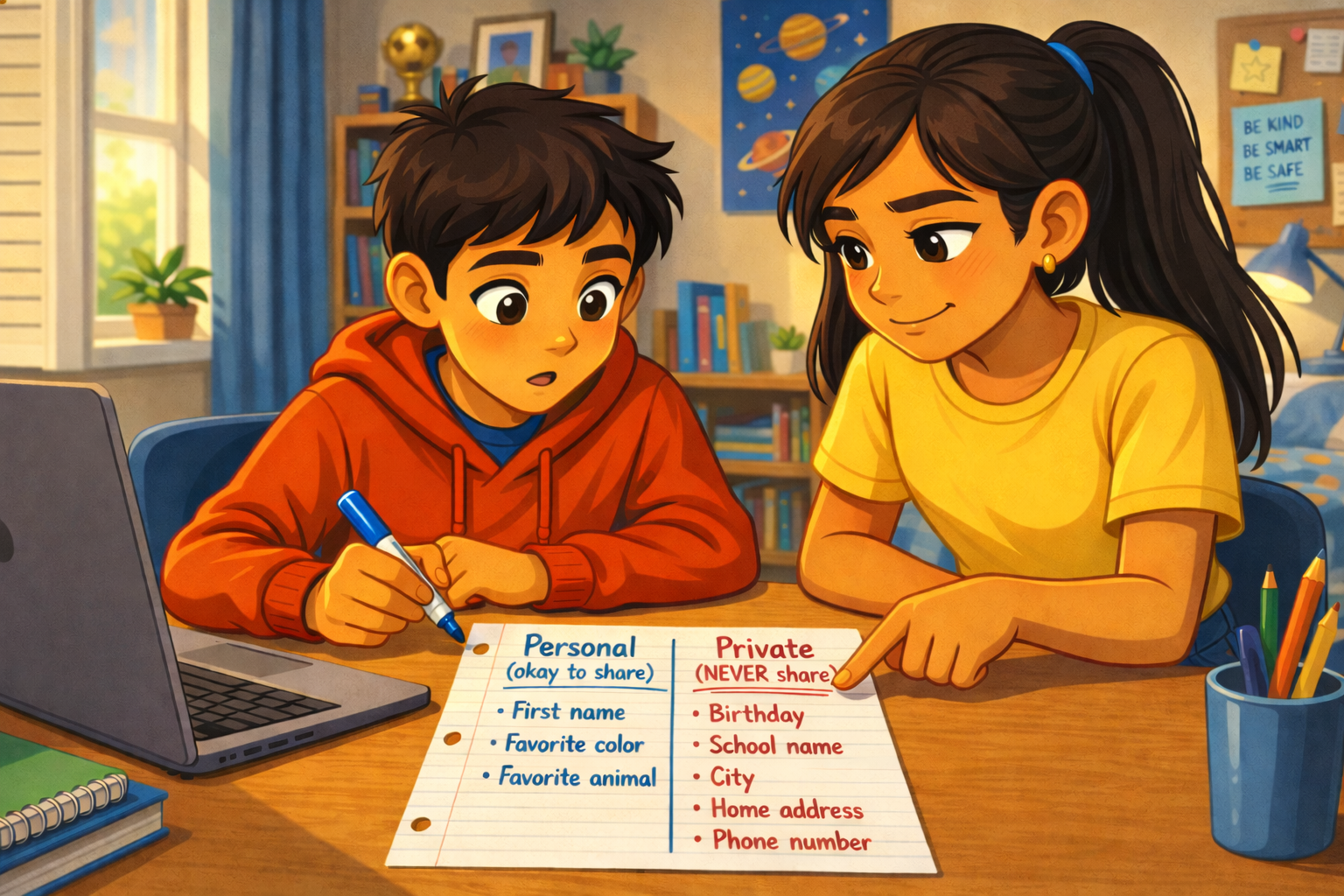 Noah and his sister sit together. She grabs a piece of paper and draws a line down the middle. On one side she writes "Personal — okay to share." On the other side she writes "Private — NEVER share."