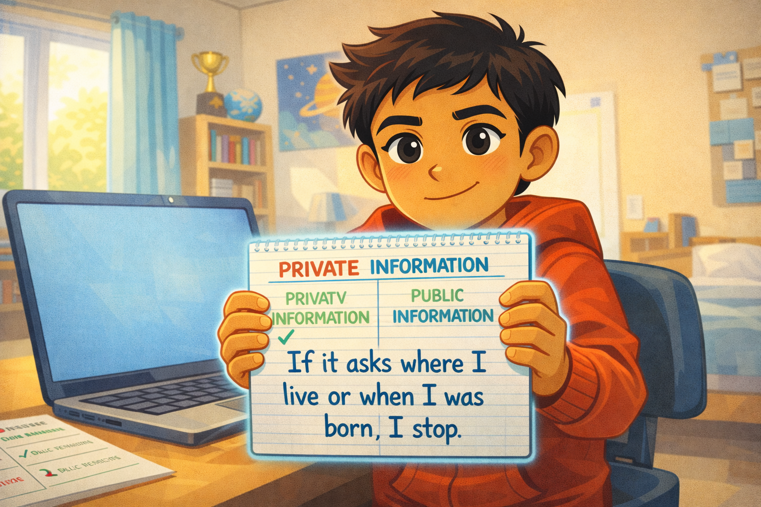 That is his rule now. Simple. Clear. Easy to remember. He does not need to figure out every quiz or every website. He just needs to know the difference between personal and private — and stop when a question crosses the line.