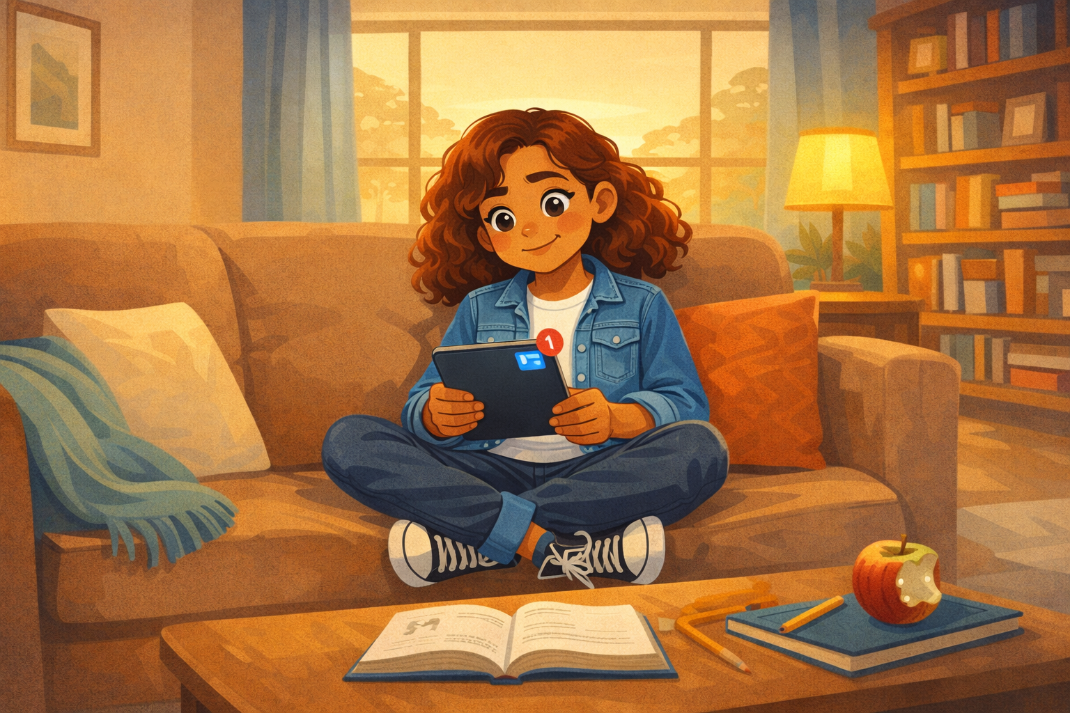 Please generate a new wide-landscape image. A wide establishing shot of a cozy living room on a quiet afternoon. Zara — a fifth-grade girl with curly auburn hair, warm tan skin, wearing a denim jacket over a white t-shirt, dark jeans, and high-top sneakers — sits cross-legged on a big soft couch. A throw blanket is draped over the arm of the couch. A tabletop lamp casts warm light. Behind her, a bookshelf filled with colorful chapter books and a small potted plant. Through a window, late-afternoon golden light filters in.