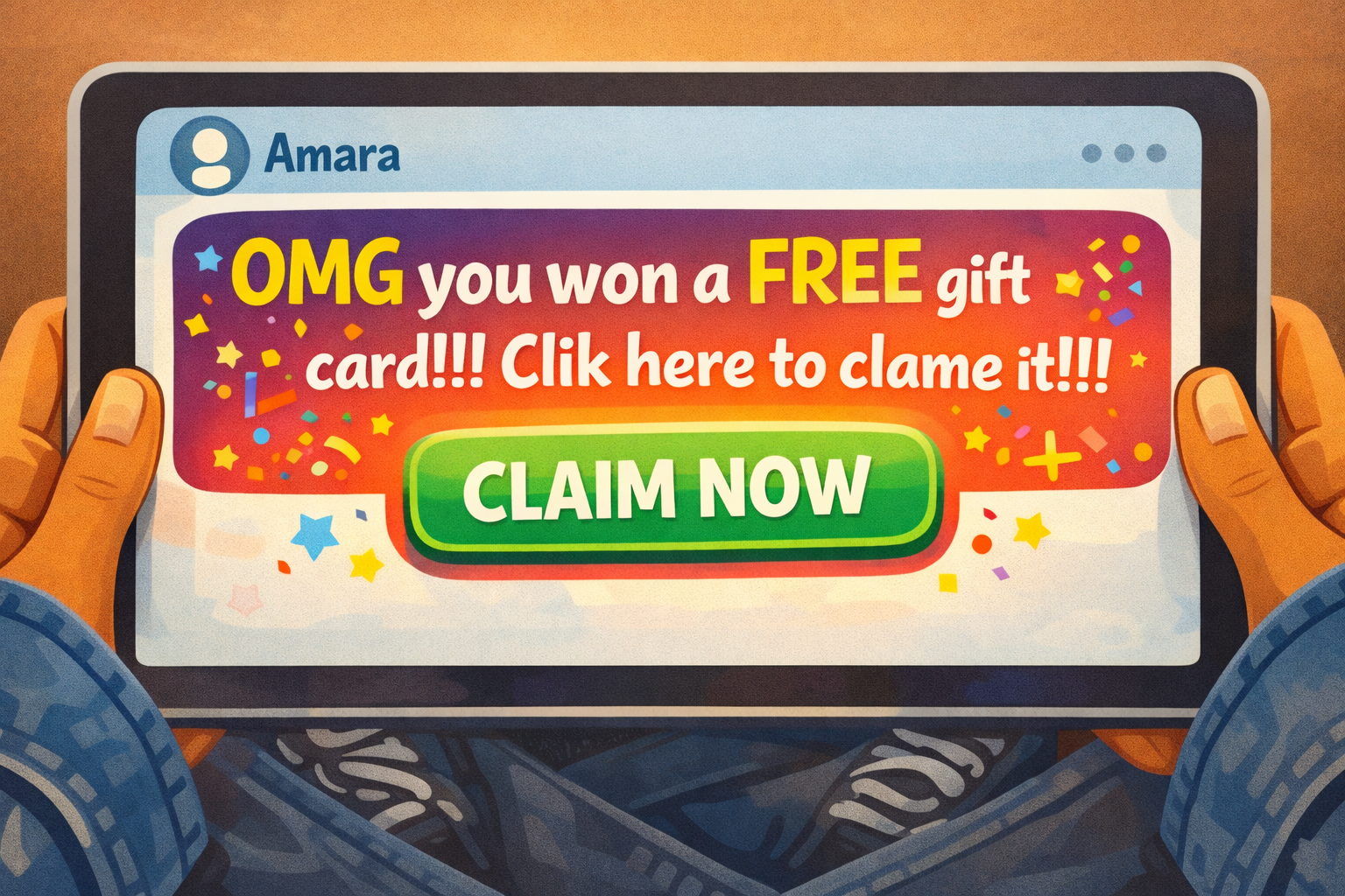 The message says: "OMG you won a FREE gift card!!! Clik here to clame it!!!" A big green button says "CLAIM NOW." Confetti emojis fill the screen. Zara's eyes go wide. A free gift card? From Amara? Her heart beats a little faster.