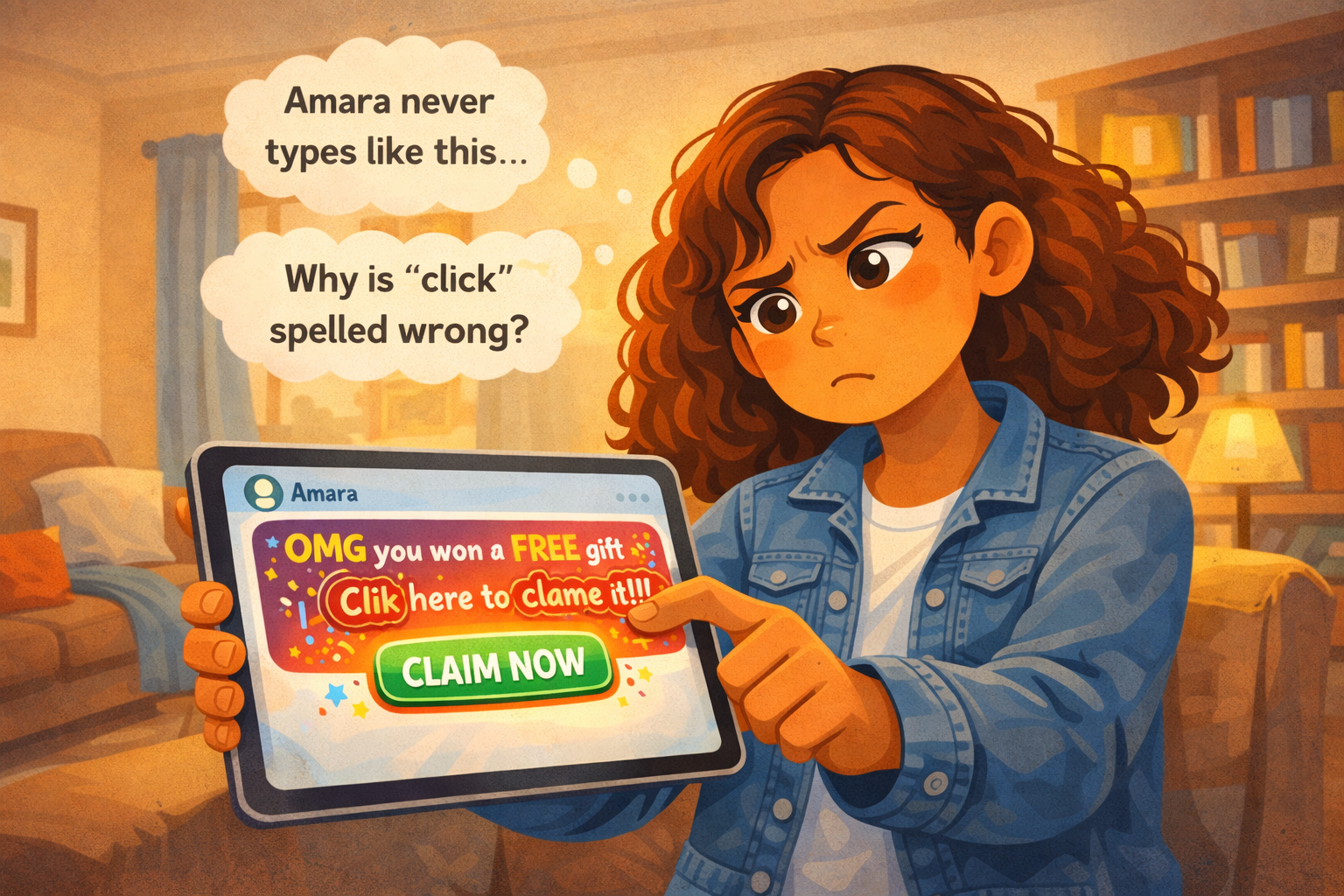 Then Zara stops. Something feels off. She looks at the message again. "Clik" is spelled wrong. "Clame" is spelled wrong. And Amara never uses that many exclamation marks. Amara's messages are short and chill. This message is loud and pushy.