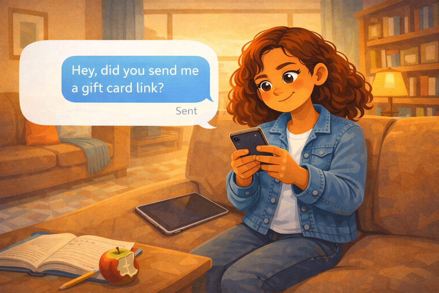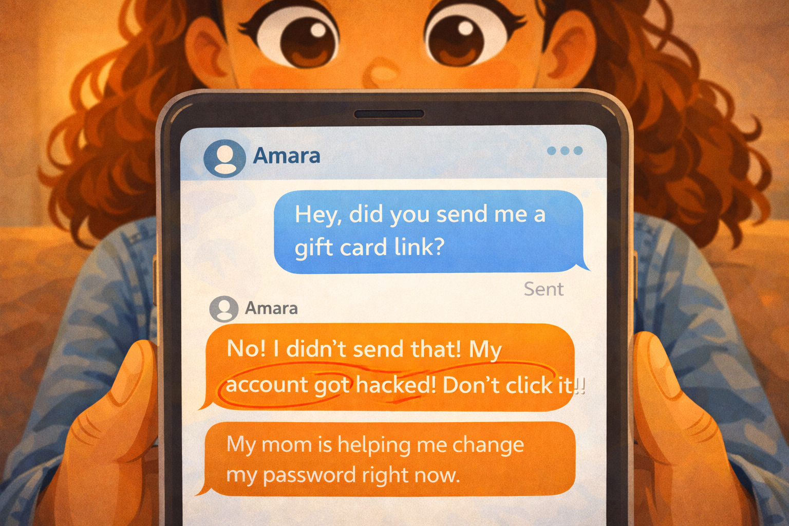 Zara stares at the screen. The gift card was fake. The message was not from Amara at all. Someone got into Amara's account and sent that link to everyone on her contact list. It was a phishing message — designed to look real so people would click without thinking.
