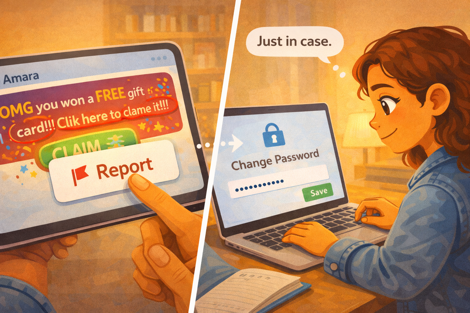 | The report | She flagged the fake message | Reporting protects other people, not just you |