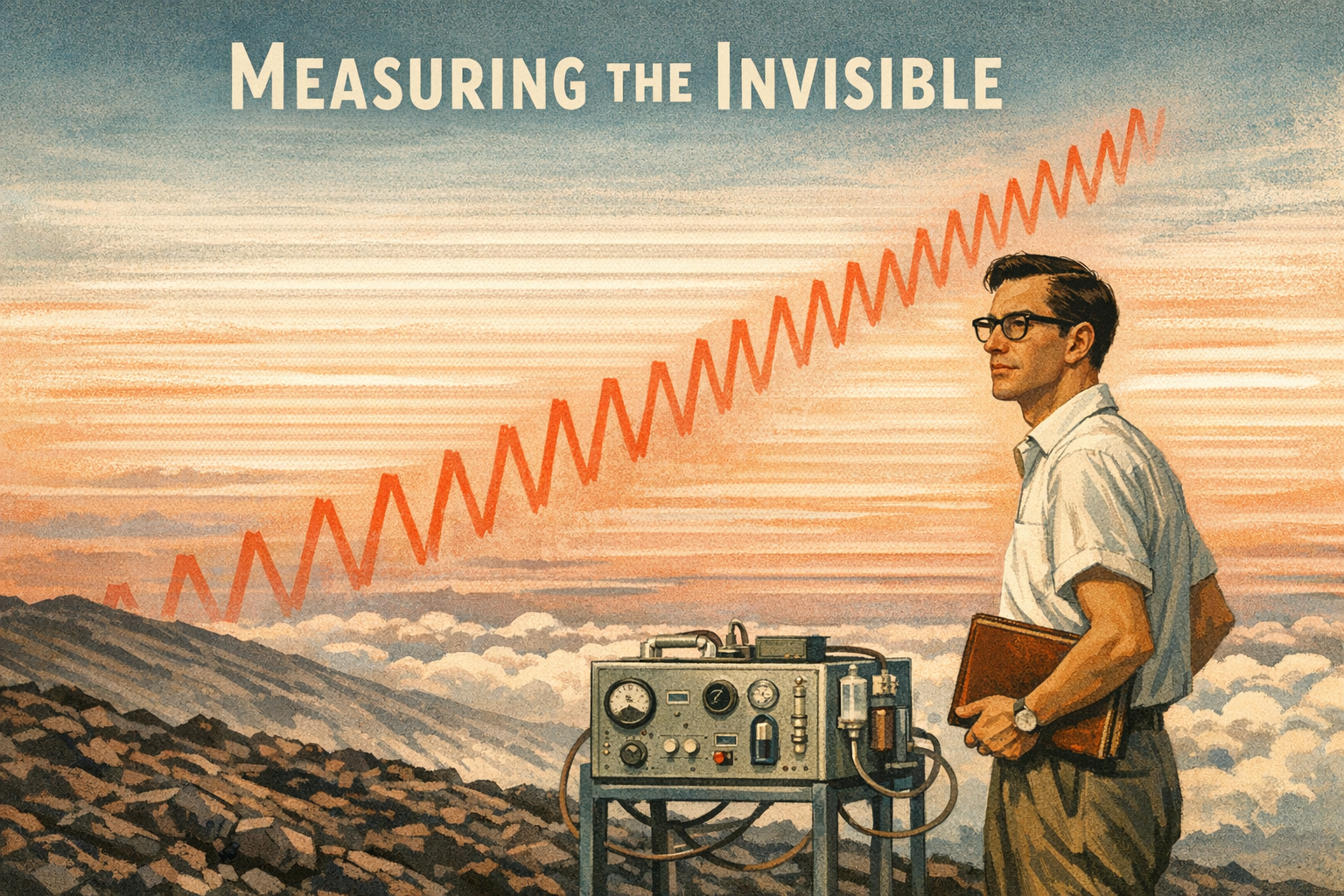 In 1958, a young chemist drives to the top of Mauna Loa with a homemade CO₂ analyzer and starts measuring. Funding agencies repeatedly try to cut his "boring" monitoring program. Keeling fights to keep it alive for forty-seven years. The Keeling Curve becomes the single most important graph in climate science. -