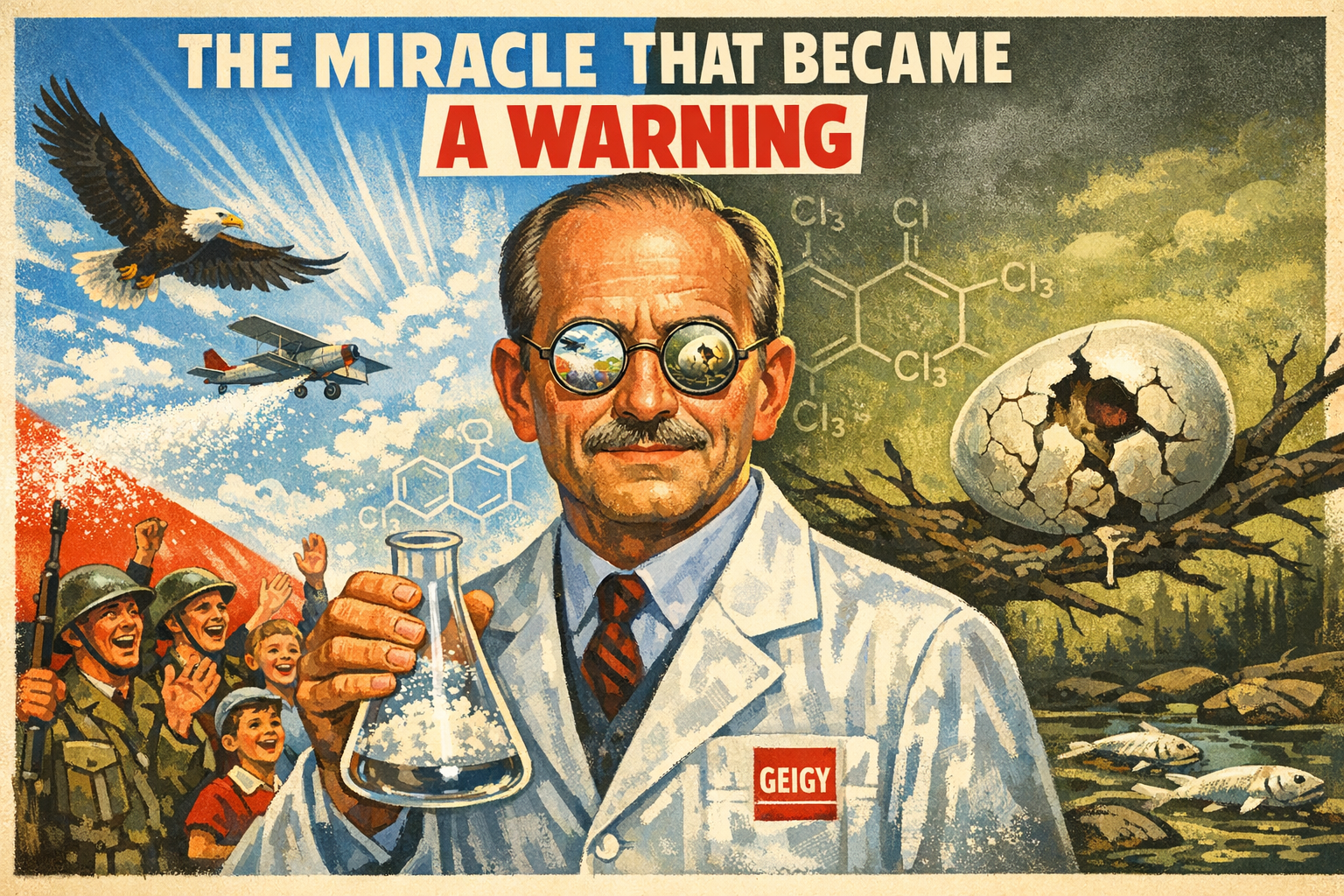 A Swiss chemist discovers that DDT kills insects on contact and wins the 1948 Nobel Prize. His miracle powder saves millions from malaria. But within two decades, DDT accumulates up food chains through biomagnification and eagle populations collapse. This is not a story about a villain — it's about what happens when no one asks "what happens next?" -
