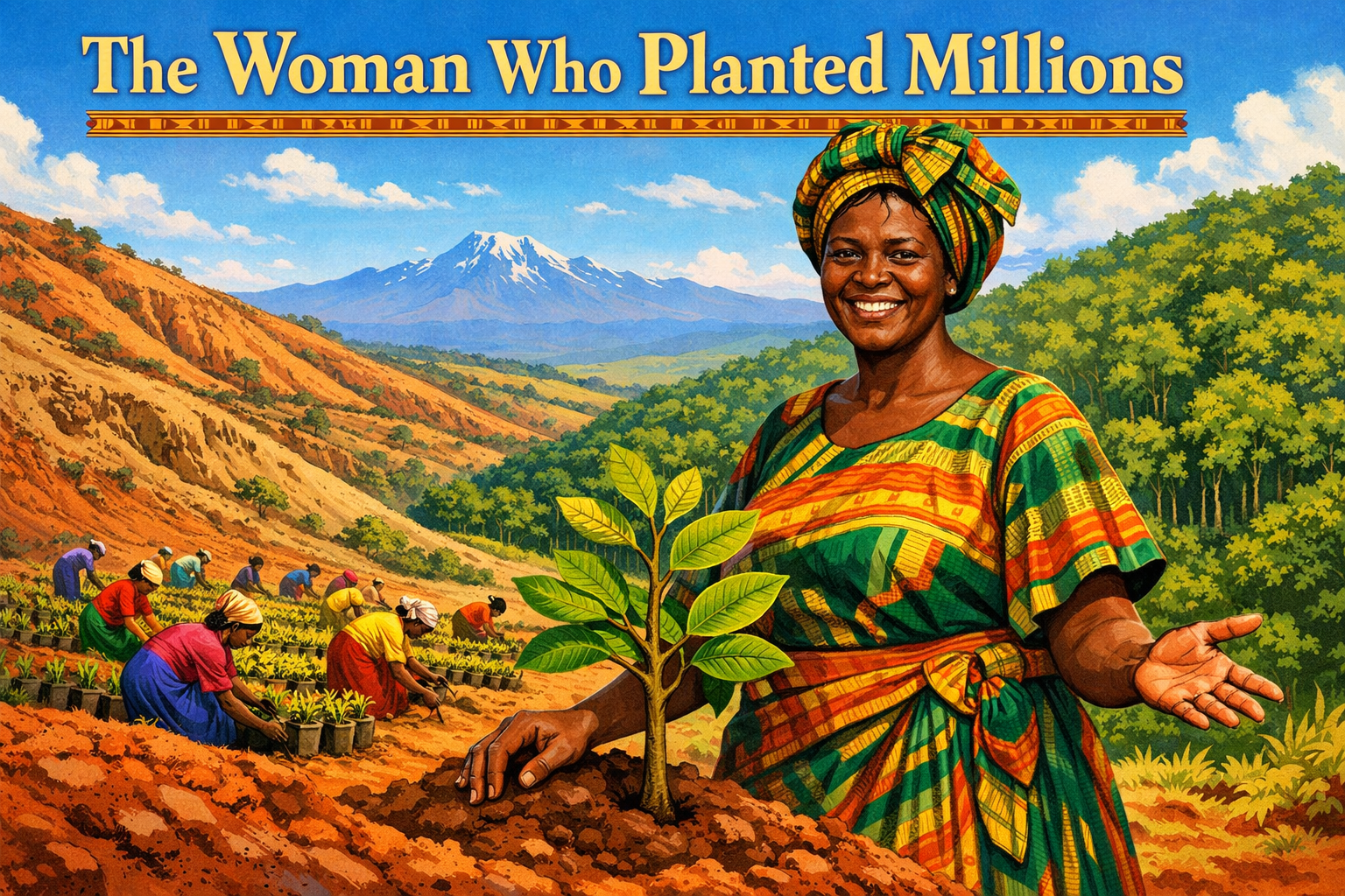 A Kenyan biologist starts paying rural women a few shillings to plant native trees. The government calls her a madwoman and has her beaten and jailed. But the Green Belt Movement grows — fifty million trees planted, thousands of women empowered, and entire watersheds restored. In 2004, Maathai becomes the first African woman to win the Nobel Peace Prize. -