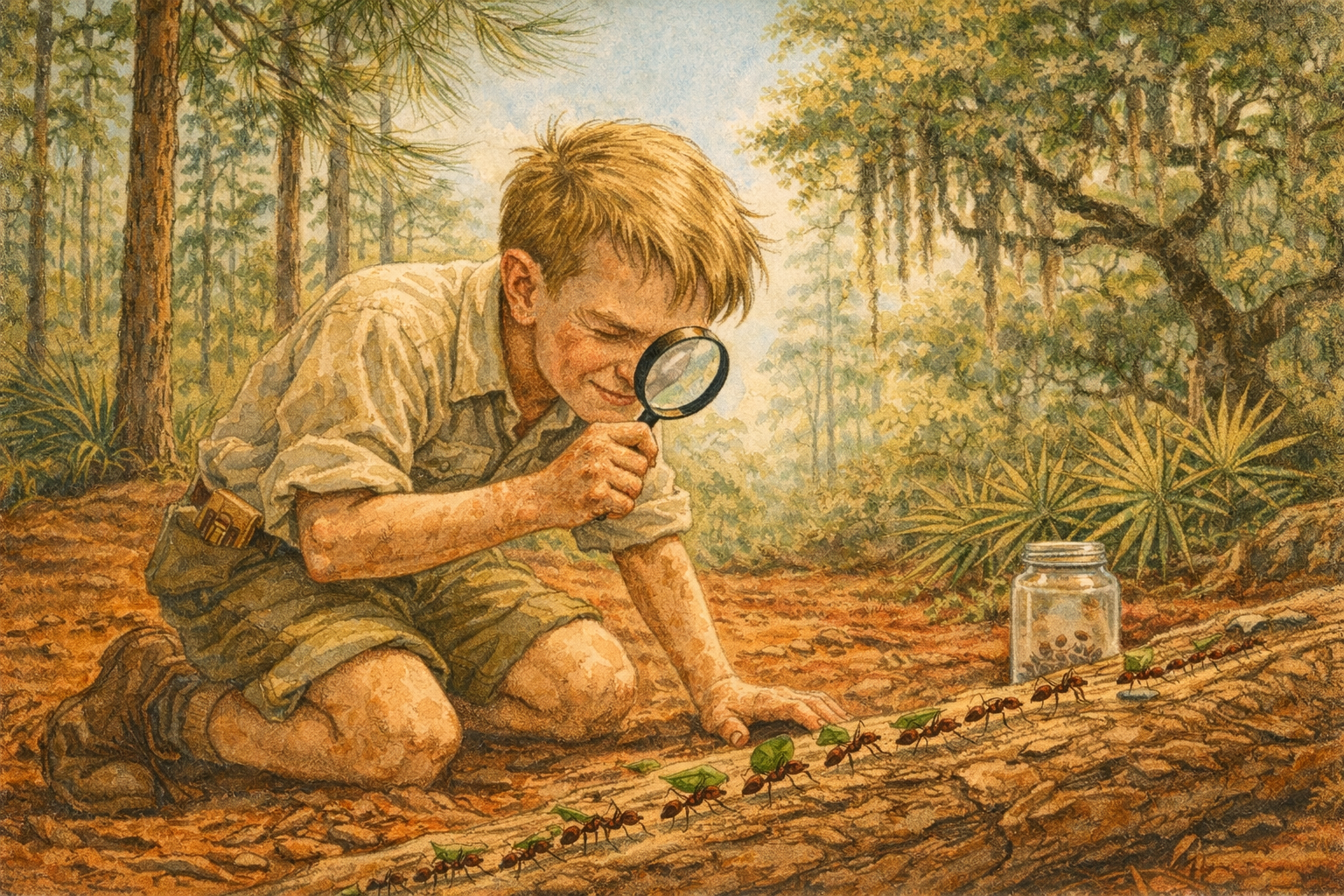 I am about to ask you to generate a series of images for a graphic novel. Please make the images have a consistent style and consistent characters. Do not ask any clarifying questions. Just generate the image immediately when asked. Please generate a 16:9 image in a warm Southern naturalist illustration style — red clay earth, Spanish moss greens, humid gold light, bayou browns — depicting panel 1 of 12. The scene shows young Edward O. Wilson, around age 11, in the pine forests outside Mobile, Alabama, in the early 1940s. He is a skinny, freckled boy with sandy hair and oversized curiosity, kneeling on the forest floor with a magnifying glass pressed to his good left eye, studying a column of ants streaming across a fallen longleaf pine log. His right eye is slightly squinted shut — the blind eye, a subtle but consistent detail. He wears a rumpled cotton shirt, short pants, and scuffed shoes. The forest around him is thick with longleaf pines, Spanish moss draping from live oaks, and palmetto fronds. A glass jar with holes punched in the lid sits beside him, already containing a few captured ant specimens. Color palette: warm red-clay soil, deep green pine needles, silvery Spanish moss, golden humid light filtering through the canopy, pale blue sky glimpsed above. Emotional tone: total absorption, a child discovering his calling. Specific details: (1) young Wilson's magnifying glass held to his left eye, right eye subtly squinted, (2) ants in vivid detail on the pine log — a clear trail with workers carrying leaf fragments, (3) longleaf pines towering above with characteristic long needles, (4) Spanish moss hanging from a live oak in the background, (5) the glass collection jar with tiny specimens visible inside, (6) a dog-eared field guide to insects poking out of his back pocket. Generate the image immediately without asking clarifying questions.Ed Wilson was not a normal kid. While other boys in Mobile, Alabama threw baseballs and chased each other through the streets, Ed lay on his belly in the pine woods and watched ants. Hours. Whole afternoons. He had lost the sight in his right eye when a fish spine pierced it during a casting accident at age seven — a freak injury that closed the world of birds and big game to him forever. But the world of insects, the world you study with your face six inches from the ground, was clearer than ever. He could see individual hairs on an ant's leg. He could follow a column of fire ants for a hundred yards without losing his place. He did not know that the fire ants he was tracking were an invasive species that would reshape the ecology of the American South. He did not know that his obsession would reshape the science of ecology itself. He just knew he could not stop watching.