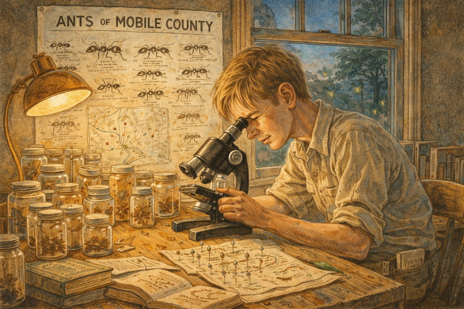 Please generate a 16:9 image in warm Southern naturalist illustration style — red clay, Spanish moss greens, humid gold, bayou browns — depicting panel 2 of 12. Make the characters and style consistent with the prior panel. The scene shows teenage Edward O. Wilson, around age 16, in the late 1940s, at a rough wooden desk in his bedroom in Mobile, Alabama. The desk is covered with specimen jars, pinned ant specimens mounted on cards, a battered microscope, hand-drawn maps of ant colony locations, and stacks of entomology books. Wilson, now a lanky teenager with sandy hair falling across his forehead and his right eye still subtly different, bends over the microscope with complete focus. On the wall behind him, he has pinned a hand-drawn poster titled "ANTS OF MOBILE COUNTY" with careful sketches of different species. A window shows the humid Alabama evening outside, fireflies glowing in the dusk. Color palette: warm lamp-light gold on the desk, deep browns of the wooden furniture, green of the Alabama evening through the window, amber specimen jars, pale parchment of his drawings. Emotional tone: obsessive dedication, the birth of a scientist. Specific details: (1) Wilson at the microscope, his good left eye pressed to the eyepiece, (2) dozens of specimen jars covering the desk, (3) the hand-drawn "ANTS OF MOBILE COUNTY" poster showing meticulous species sketches, (4) a well-worn copy of a field guide or entomology text, (5) hand-drawn maps with colored pins marking colony locations, (6) fireflies visible through the window in the Alabama twilight. Generate the image immediately without asking clarifying questions.By sixteen, Ed Wilson had become the most thorough ant surveyor in the state of Alabama, though no one in the state knew it yet. He bicycled through swamps and forests, collecting specimens in glass jars, pinning them on cards, and cataloging every species he could find. He taught himself taxonomy from library books and corresponded with entomologists at the Smithsonian who had no idea their pen pal was a high school student. He discovered that the red imported fire ant — Solenopsis invicta — had invaded Mobile through the port and was spreading across the South with terrifying speed. It was his first brush with the ecology of invasive species, and the first hint of a pattern that would define his career: pay attention to the small things, and they will tell you something enormous about how the world works.