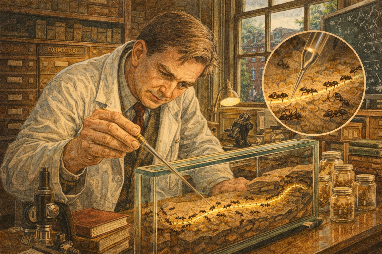 Please generate a 16:9 image shifting from Southern naturalist warmth to a Harvard Ivy League aesthetic — brick red, dark green, leather brown, library gold — depicting panel 3 of 12. Make the characters and style consistent with the prior panels. The scene shows Edward O. Wilson, now in his late 20s, in his laboratory at Harvard University's Museum of Comparative Zoology in the early 1960s. He is lean and clean-shaven with sharp, focused features, wearing a white lab coat over a tweed jacket. He leans over a large glass ant farm — a formicarium — watching ants respond to a chemical trail he has laid with a fine glass pipette. A magnified view (as an inset or visual emphasis) shows the chemical pheromone trail glowing faintly along the ants' path. The lab is cluttered with Harvard grandeur: dark wooden shelves lined with specimen drawers, leather-bound journals, brass microscopes, and ant colony terrariums of various sizes. Color palette: Harvard brick red visible through the window, dark green ivy on the building exterior, warm library gold from desk lamps, brown leather book spines, the white of his lab coat, amber glass of the formicarium. Emotional tone: intellectual intensity, the thrill of discovery. Specific details: (1) Wilson with the glass pipette laying a pheromone trail, his left eye intent on the ants' response, (2) the formicarium showing a cross-section of tunnels and chambers, (3) a visual emphasis on the pheromone trail — perhaps shown as a glowing line, (4) dark wood specimen cabinets labeled "FORMICIDAE" in gold lettering, (5) Harvard's brick buildings and ivy visible through the lab window, (6) a chalkboard in the background covered with chemical formulas and ant communication diagrams. Generate the image immediately without asking clarifying questions.Wilson arrived at Harvard and never left. He joined the faculty at the Museum of Comparative Zoology and began asking a question that no one had answered: How do ants talk to each other? The answer, he discovered, was chemistry. Ants communicate through pheromones — chemical signals that say "food this way," "danger here," "follow me," "I am the queen." Wilson and his colleagues identified the specific glands, the specific chemicals, and the specific behaviors they triggered. It was a complete language, written in molecules instead of words. The work made him famous in entomology, but Wilson was already thinking bigger. If chemical signals could organize a colony of a million ants into a superorganism, what else could evolution build? What were the rules?