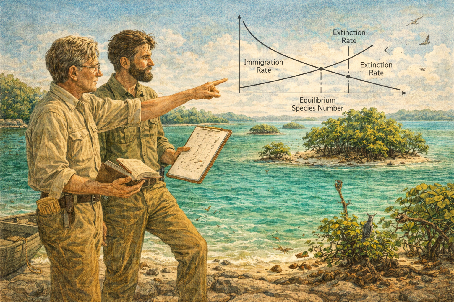 Please generate a 16:9 image blending Harvard academic aesthetic with tropical field-science energy — depicting panel 4 of 12. Make the characters and style consistent with the prior panels. The scene shows Edward O. Wilson, early 30s, and Robert MacArthur, a tall, bearded, charismatic young ecologist, standing together on a rocky shore in the Florida Keys in the mid-1960s. They look out at a chain of small mangrove islands stretching across turquoise water. Wilson holds a field notebook and points toward the islands; MacArthur holds a clipboard with mathematical curves sketched on it. Between them, a visual overlay (like a scientific diagram superimposed on the landscape) shows the core concept: two curves crossing — an "Immigration Rate" curve descending and an "Extinction Rate" curve ascending, with the intersection labeled "Equilibrium Species Number." The islands vary in size and distance from the mainland. Color palette: turquoise and cerulean ocean water, deep green mangrove islands, white sand, warm golden sunlight, the academic overlay in clean black-and-white line art. Emotional tone: intellectual partnership, the excitement of a theory taking shape. Specific details: (1) Wilson and MacArthur in khaki field clothes, deep in discussion, (2) the chain of mangrove islands in varying sizes, (3) the superimposed equilibrium diagram with labeled curves, (4) Wilson's field notebook open with ant tallies from different islands, (5) a small boat tied to the shore — their transport between islands, (6) birds, crabs, and insects visible on the nearest island showing its living community. Generate the image immediately without asking clarifying questions.In the early 1960s, Wilson found his intellectual soulmate: Robert MacArthur, a brilliant young ecologist with a gift for mathematics. Together, they asked a deceptively simple question: Why do big islands have more species than small ones? The answer became the Theory of Island Biogeography — one of the most important ideas in the history of ecology. Species richness on any island, they argued, is a dynamic equilibrium between two forces: the rate at which new species arrive (immigration) and the rate at which existing species disappear (extinction). Big islands, close to the mainland, accumulate more species. Small islands, far away, lose them. It was elegant, mathematical, and testable. Wilson even tested it himself, hiring an exterminator to fumigate tiny mangrove islands in the Florida Keys and then watching which species recolonized first. The theory worked.