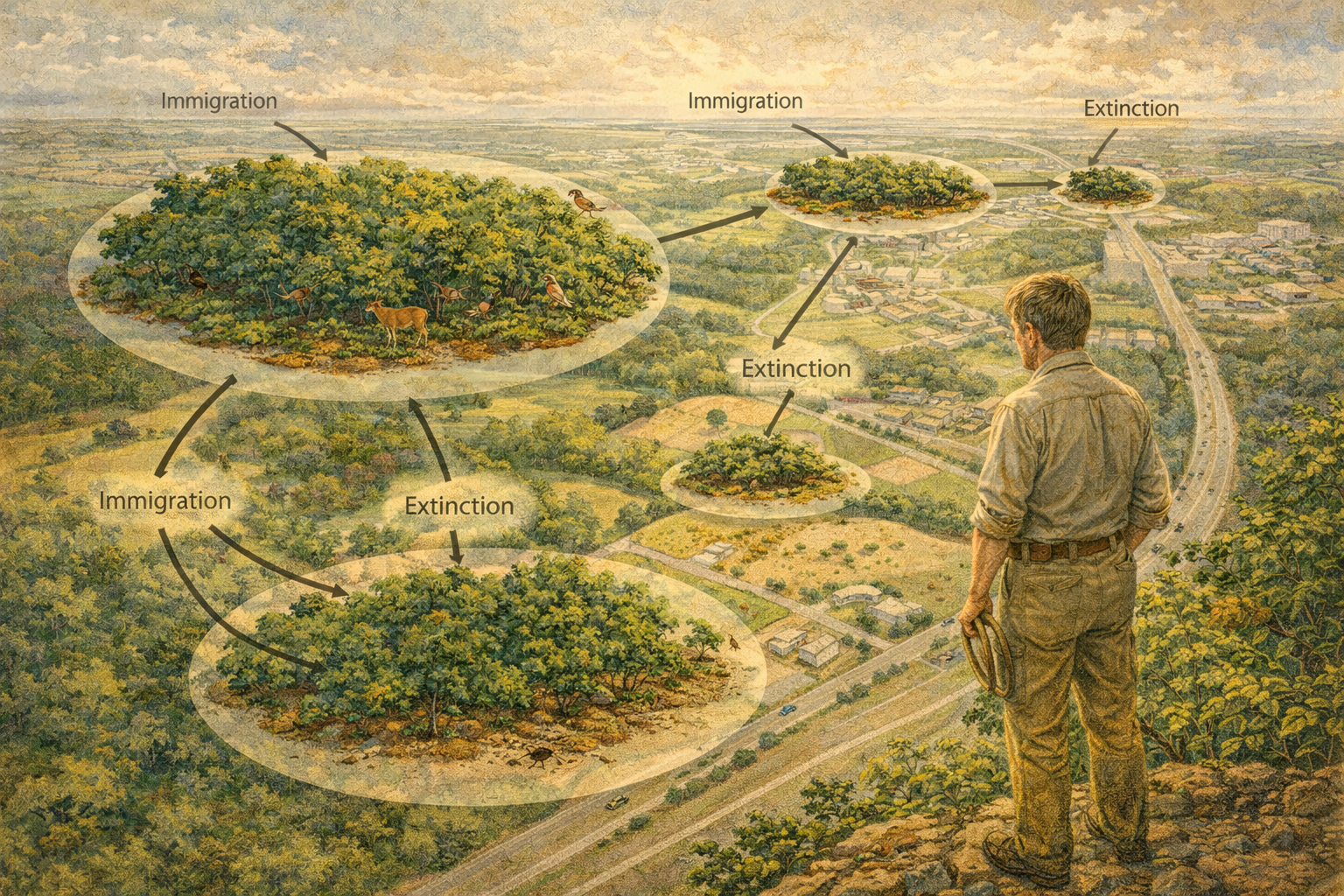 Please generate a 16:9 image in an ecological diagram style blended with naturalist illustration — depicting panel 5 of 12. Make the characters and style consistent with the prior panels. The scene is a dramatic aerial-perspective view showing the explosive implications of island biogeography for mainland habitats. The landscape shows a once-continuous forest being fragmented by roads, farms, and suburban development — each remaining forest patch is visually rendered as an "island" surrounded by a "sea" of agriculture and concrete. Some patches are large and green with diverse wildlife visible; smaller patches are brown-edged and sparse. Wilson, now in his mid-30s in khaki field clothes, stands at the edge of the largest forest fragment, looking out at the fragmented landscape with a troubled expression. A visual overlay connects the forest fragments to island diagrams: arrows show "immigration" between patches and "extinction" within isolated ones. Color palette: rich forest greens for the intact patches, agricultural tan and suburban gray for the matrix, fading browns at the edges of shrinking fragments, warm but troubled golden light. Emotional tone: dawning alarm, the moment theory becomes prophecy. Specific details: (1) the aerial perspective showing forest fragmentation as islands in a human-altered sea, (2) Wilson standing at the forest edge looking outward, (3) the visual overlay connecting fragments with biogeographic arrows, (4) wildlife visible in the large fragment — deer, birds, butterflies, (5) the smallest fragments visibly degraded with fewer species, (6) a highway cutting through the landscape like a river separating islands. Generate the image immediately without asking clarifying questions.The theory had consequences that kept Wilson awake at night. Because it was not really about islands — it was about any isolated habitat. A forest surrounded by farmland is an island. A nature reserve surrounded by suburbs is an island. A mountaintop meadow in a warming climate is an island. And the math was merciless: as habitat patches shrink and become more isolated, species disappear. Not randomly, but predictably. Cut a forest to one-tenth its original size, and you will eventually lose roughly half its species. This was not speculation — it was a mathematical relationship confirmed by data from islands around the world. Wilson had built a tool for predicting extinction. And everywhere he looked, the prediction was the same: the islands were shrinking.