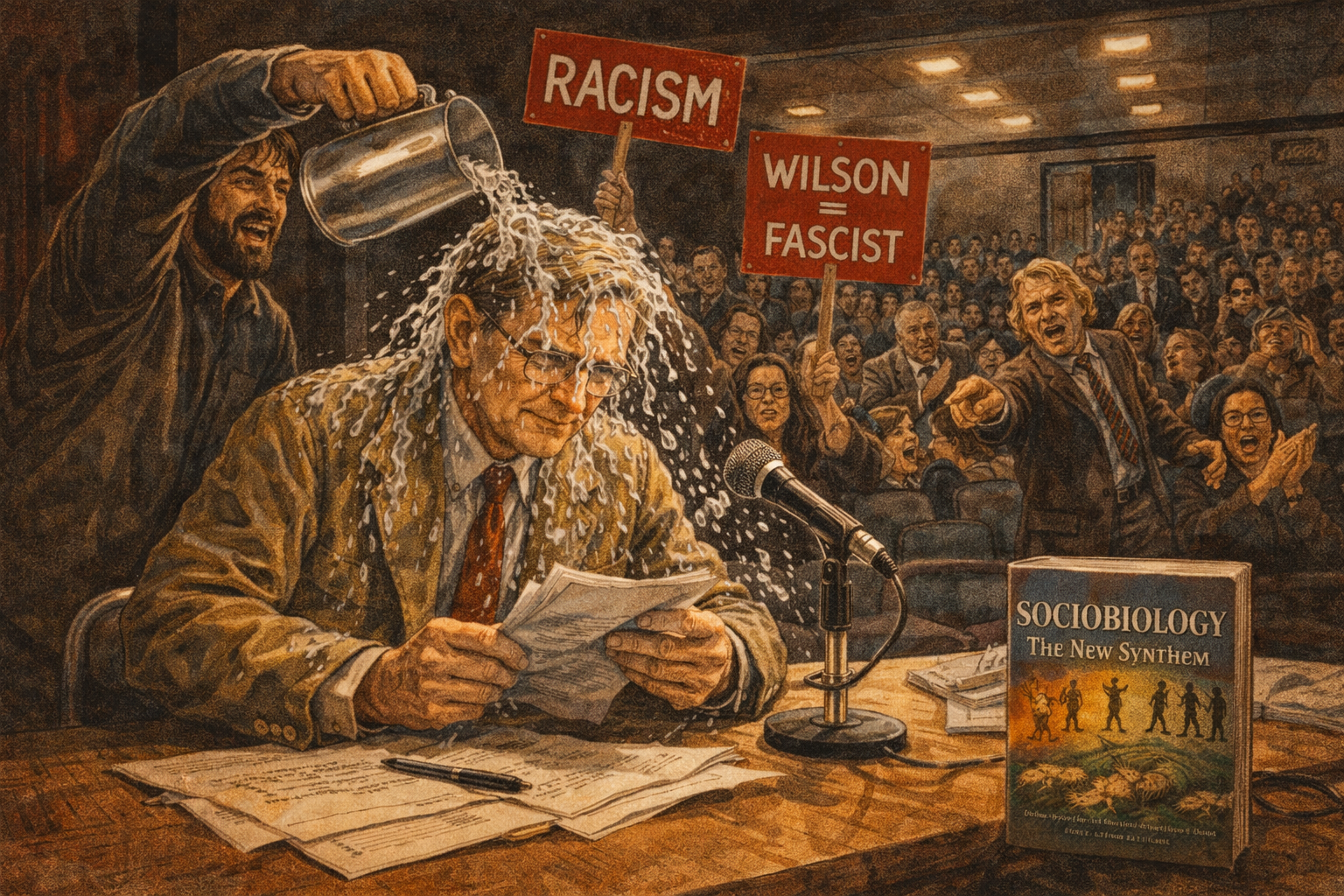 Please generate a 16:9 image in Harvard academic style with dramatic tension — brick reds, dark shadows, confrontation energy — depicting panel 6 of 12. Make the characters and style consistent with the prior panels. The scene shows the infamous 1978 incident at the American Association for the Advancement of Science meeting. Edward O. Wilson, now in his late 40s with thinning hair and wire-rimmed glasses, sits on a stage behind a conference table with a microphone, about to give a lecture on sociobiology. A protester has just rushed the stage and is dumping a pitcher of ice water over Wilson's head. Water cascades over his hair and glasses. Wilson's expression is one of shock but not defeat — his jaw is set, his hands still grip his lecture notes. Other protesters hold signs reading "RACISM" and "WILSON = FASCIST." The audience in the auditorium shows a mix of horror, anger, and support. His book "Sociobiology: The New Synthesis" is visible on the table, its cover showing a spectrum from ants to humans. Color palette: harsh fluorescent auditorium light, dark institutional browns and grays, the splash of water catching the light, the bright red of protest signs, Wilson's tan jacket darkened with water. Emotional tone: intellectual courage under literal attack. Specific details: (1) water cascading over Wilson's head and glasses, (2) his hands gripping the lecture notes — he will not stop, (3) the protester with the empty pitcher, (4) protest signs with inflammatory accusations, (5) the Sociobiology book on the table, (6) audience members on their feet — some appalled, some cheering the protest. Generate the image immediately without asking clarifying questions.In 1975, Wilson published Sociobiology: The New Synthesis, a monumental book arguing that social behavior — in ants, in wolves, in primates, and yes, in humans — has an evolutionary basis shaped by natural selection. The science was meticulous. The reaction was volcanic. Critics accused him of genetic determinism, of justifying racism and sexism, of resurrecting Social Darwinism. At a 1978 conference, a protester stormed the stage and dumped a pitcher of ice water over his head, shouting "Wilson, you're all wet!" Wilson sat there, dripping, and then gave his lecture anyway. He had been called a racist for suggesting that human nature has a biological component. The irony was bitter — this was a man whose life's work was devoted to showing that all life is interconnected, that no species is expendable, that the diversity of life is sacred. The controversy wounded him. But it also pushed him toward the cause that would define his final decades.