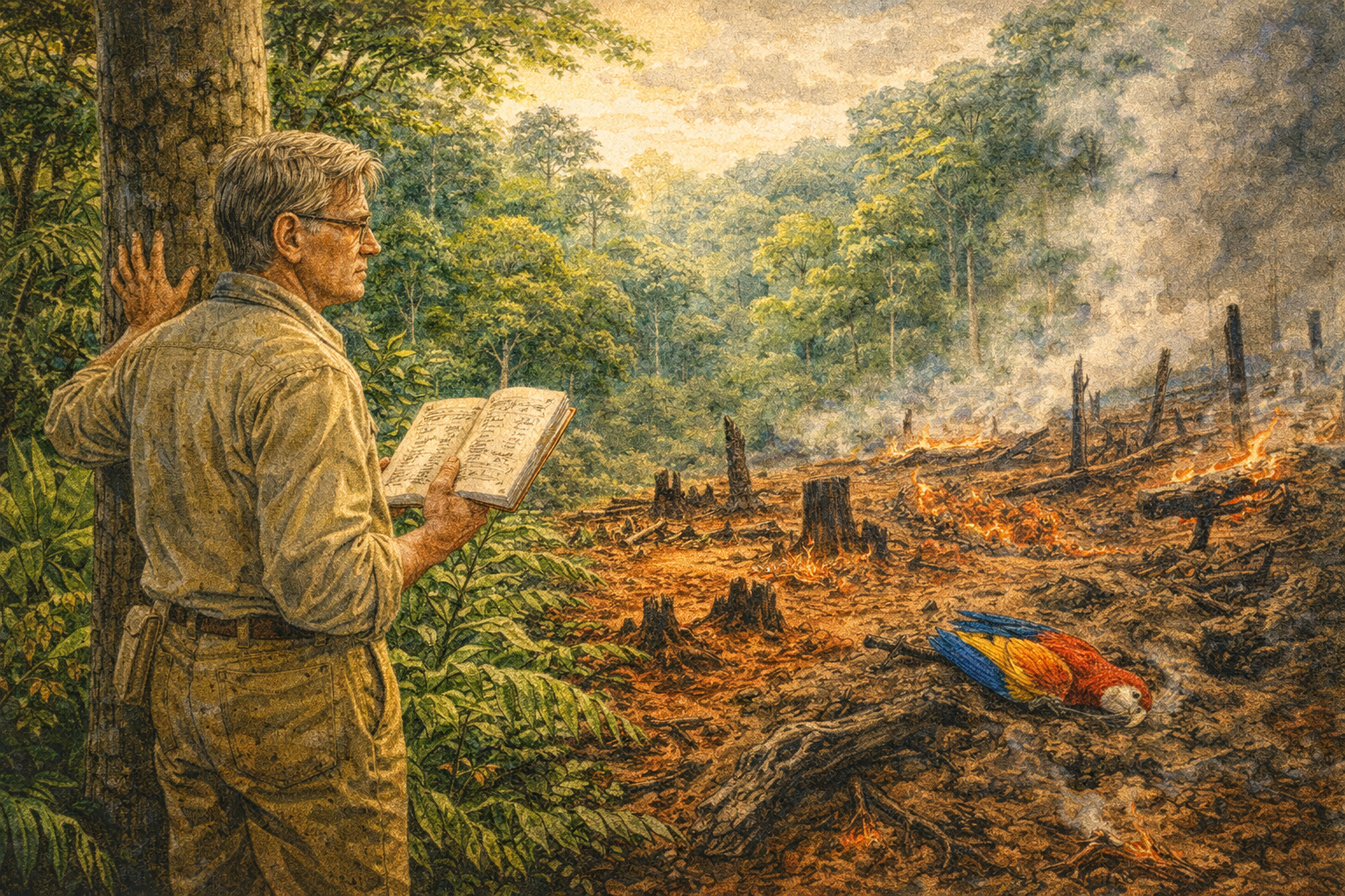Please generate a 16:9 image transitioning from Harvard academic to global conservation aesthetic — the palette warming and expanding toward tropical greens and urgent reds — depicting panel 7 of 12. Make the characters and style consistent with the prior panels. The scene shows Wilson, now in his early 50s, standing at the edge of a clearing in a tropical rainforest — probably the Amazon or Borneo — in the early 1980s. Behind him, intact rainforest rises in magnificent layers of green. Before him, the forest has been slashed and burned — charred stumps, red exposed soil, smoke still rising from smoldering logs. He holds his field notebook in one hand, the other hand pressed against a surviving tree trunk as if steadying himself against the scale of the destruction. His expression is grief mixed with fierce determination. Color palette: lush tropical greens behind him (emerald, jade, lime), devastation colors before him (charcoal black, raw sienna, smoke gray, angry red of exposed laterite soil), golden light breaking through the canopy behind, harsh flat light over the cleared area. Emotional tone: the turning point — from pure science to urgent advocacy. Specific details: (1) Wilson at the boundary between intact forest and destruction, (2) the magnificent layered rainforest canopy behind him, (3) charred stumps and smoldering ground before him, (4) his hand touching the trunk of the last standing tree at the edge, (5) a dead bird — a tropical parrot or toucan — lying in the ash, (6) his field notebook open to a page listing species observed, some now crossed out. Generate the image immediately without asking clarifying questions.Wilson had spent decades building the theory that predicted how species disappear. Now he watched the prediction come true in real time. Tropical rainforests — the most species-rich ecosystems on Earth — were being burned and bulldozed at a rate of tens of millions of acres per year. Coral reefs were bleaching. Wetlands were being drained. And Wilson, who had spent more time looking at the small and overlooked creatures of the world than perhaps any living scientist, understood something that the big-picture people missed: it was not just the charismatic species — the tigers, the whales, the pandas — that were vanishing. It was the insects, the fungi, the soil microbes, the tiny organisms that hold ecosystems together. The fabric of life was unraveling thread by thread, and most people could not see it because they had never learned to look down.