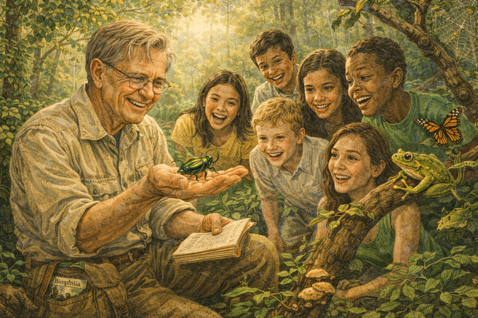 Please generate a 16:9 image in a warm, luminous style that conveys the emotional and psychological connection between humans and nature — depicting panel 8 of 12. Make the characters and style consistent with the prior panels. The scene shows Wilson, mid-50s, sitting in a sun-dappled forest clearing, surrounded by a diverse group of children and young adults of different ethnicities who are utterly captivated as he holds up a large tropical beetle on his open palm. The beetle is iridescent green and gold. The students lean in, some with expressions of wonder, some with delighted surprise. Wilson's face shows pure joy — this is his biophilia concept made visible: the innate human attraction to other living things. The forest around them is alive with detail: butterflies, a tree frog on a nearby branch, mushrooms on a log, a spider web catching sunlight. Color palette: warm dappled golden light through green canopy, rich browns of forest floor, iridescent greens and golds of the beetle, warm skin tones of the diverse group, soft emerald of surrounding foliage. Emotional tone: enchantment, connection, the deep human need for nature. Specific details: (1) Wilson holding the iridescent beetle on his open palm with visible delight, (2) the diverse group of young people leaning in with wonder, (3) the sun-dappled forest setting alive with organisms, (4) a butterfly landing on a student's shoulder unnoticed, (5) a tree frog on a branch at eye level, (6) Wilson's book "Biophilia" visible tucked under his field bag on the ground. Generate the image immediately without asking clarifying questions.In 1984, Wilson published Biophilia, and in it he made an argument that was radical in its simplicity: humans need nature. Not just for food, fiber, and clean water — but for our minds, our emotions, our sanity. He called it the "biophilia hypothesis": the idea that hundreds of thousands of years of evolution have hardwired us to respond to the living world. We are calmed by green landscapes. We are drawn to water. We are fascinated by other animals. We feel something profound in the presence of an old-growth forest that no shopping mall can replicate. Wilson was saying something that poets had always known but scientists had been afraid to claim: that the destruction of nature is not just an economic problem or an ethical problem — it is a psychological wound, a severing of a bond as old as our species.