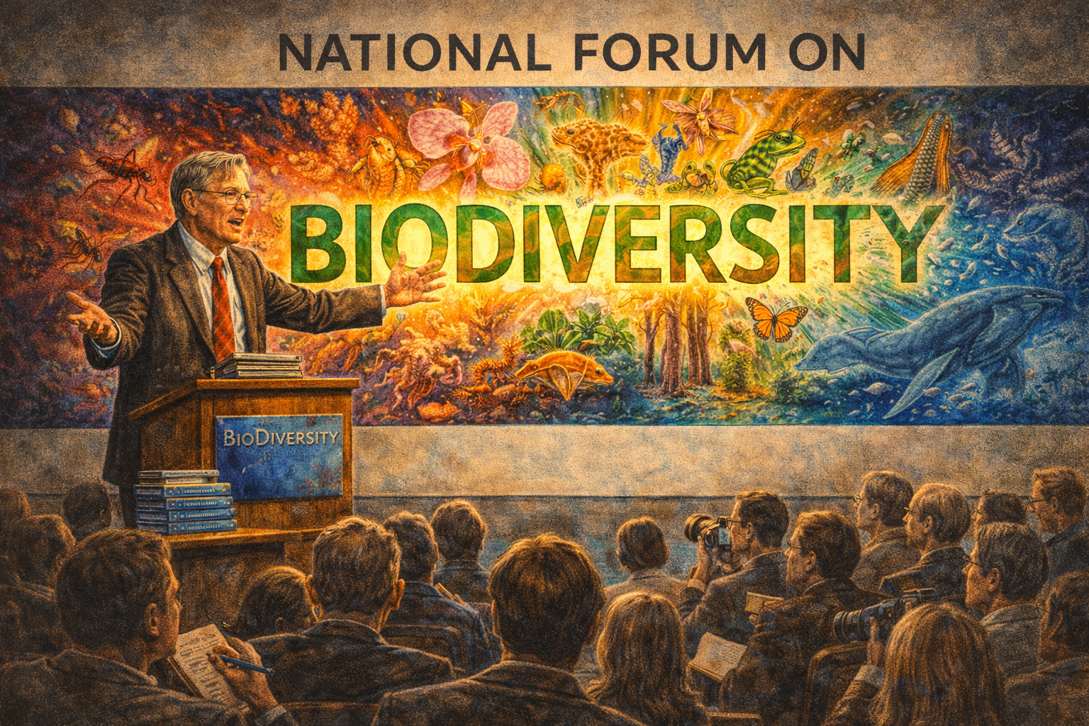 Please generate a 16:9 image in a bold, visually striking style that captures the power of naming — depicting panel 9 of 12. Make the characters and style consistent with the prior panels. The scene shows Wilson, late 50s, at a podium in a grand conference hall in Washington, D.C., in 1988, at the National Forum on BioDiversity. He stands at a podium with a large banner behind him reading "NATIONAL FORUM ON BIODIVERSITY." The word "BIODIVERSITY" is rendered enormous on the banner, glowing with significance. Wilson gestures broadly as he speaks to an audience of scientists, policymakers, and journalists. Behind the text, a montage of life forms radiates outward: ants, orchids, coral, frogs, fungi, bacteria, sequoias, butterflies, whales — the full spectrum of Earth's living diversity. Color palette: institutional conference-hall neutrals (gray, beige) contrasted with the explosion of color in the biodiversity montage — every color in nature represented. The word BIODIVERSITY in bold green and gold. Emotional tone: the christening of a movement, the moment a concept gets a name and becomes unstoppable. Specific details: (1) Wilson at the podium, passionate and commanding, (2) the banner with BIODIVERSITY prominent, (3) the montage of life forms radiating from the word, (4) the mixed audience of scientists and policymakers, (5) journalists with notebooks and cameras in the front rows, (6) a stack of the forum's proceedings visible on the podium — the book that would be titled "BioDiversity." Generate the image immediately without asking clarifying questions.Before 1988, the concept existed but had no name. Scientists talked about "species richness" and "biological diversity," but those phrases were academic, clinical, forgettable. Then Wilson organized the National Forum on BioDiversity in Washington, D.C., and the shortened word — biodiversity — entered the language like a seed finding soil. It was perfect: scientific enough to be taken seriously, simple enough for a newspaper headline, emotional enough to rally a movement. Wilson edited the proceedings into a book, and suddenly every environmental organization, every policy debate, every school textbook had a new word and a new urgency. Biodiversity was not just a list of species — it was the living infrastructure of the planet, the result of 3.8 billion years of evolution, and it was disappearing faster than at any time since the asteroid that killed the dinosaurs.