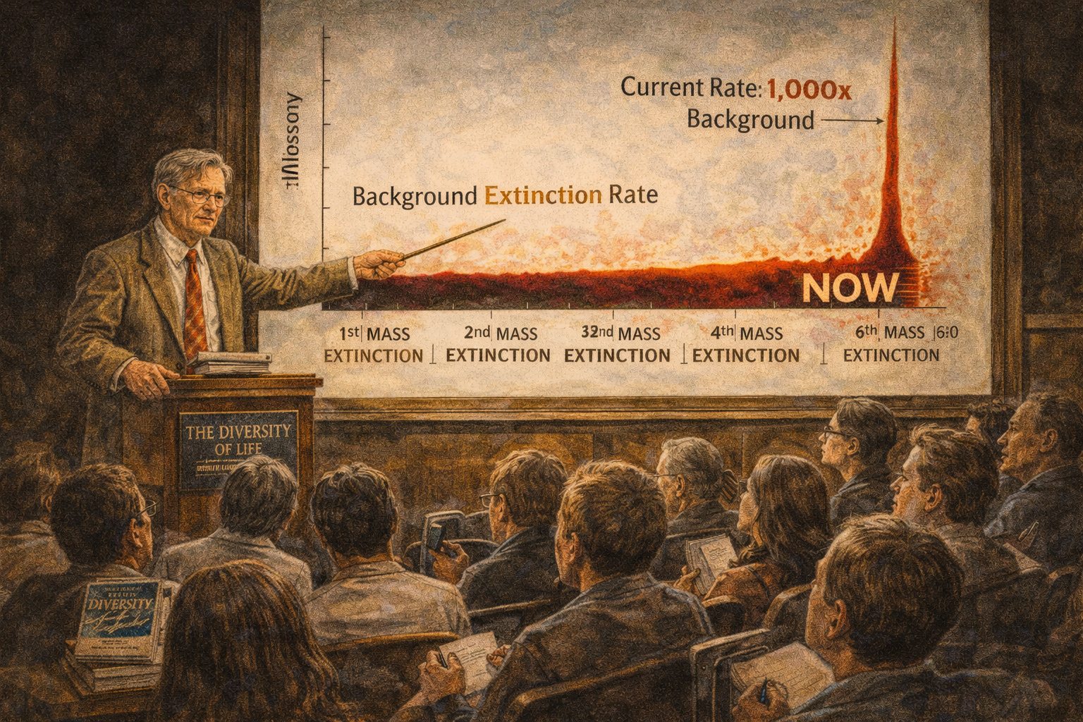 Please generate a 16:9 image in a dramatic, data-driven ecological illustration style — depicting panel 10 of 12. Make the characters and style consistent with the prior panels. The scene shows Wilson, now in his early 60s with silver hair and wire-rimmed glasses, standing before a massive chalkboard or presentation screen in a Harvard lecture hall in the early 1990s. On the screen is a dramatic graph showing extinction rates: a flat baseline labeled "Background Extinction Rate" stretching across geological time, and then a nearly vertical spike at the present day labeled "Current Rate: 1,000x Background." Below the graph, a timeline shows the five previous mass extinctions as dips in biodiversity, with the sixth — labeled "NOW" in red — just beginning. Wilson points to the spike with a pointer, his expression grave but resolute. The lecture hall is packed with students and faculty. Color palette: dark lecture-hall atmosphere with warm wood tones, the graph glowing in stark reds and blacks against a white screen, Wilson illuminated by the projector light, the audience in shadow. Emotional tone: scientific alarm delivered with professorial authority. Specific details: (1) Wilson pointing at the extinction rate spike, (2) the graph clearly showing the 1,000x increase, (3) the five previous mass extinctions marked on the timeline, (4) the word "NOW" in red at the present-day spike, (5) a copy of "The Diversity of Life" on the lectern, (6) students in the packed hall — some taking furious notes, some visibly shaken. Generate the image immediately without asking clarifying questions.In 1992, Wilson published The Diversity of Life, and the numbers he assembled were staggering. Species were going extinct at roughly one thousand times the natural background rate — the rate that had prevailed for millions of years between mass extinction events. This was not a gradual decline. This was a catastrophe with a speed that rivaled the asteroid impact that ended the Cretaceous. Wilson did the math: if tropical deforestation continued at its current pace, half of all species on Earth could be gone within a century. He called it the "sixth extinction," and unlike the first five — caused by volcanism, glaciation, and asteroid impacts — this one had a single cause: us. Habitat destruction, invasive species, pollution, population growth, overharvesting. Wilson gave these threats an acronym that would become a teaching tool for a generation of conservation biologists: HIPPO.