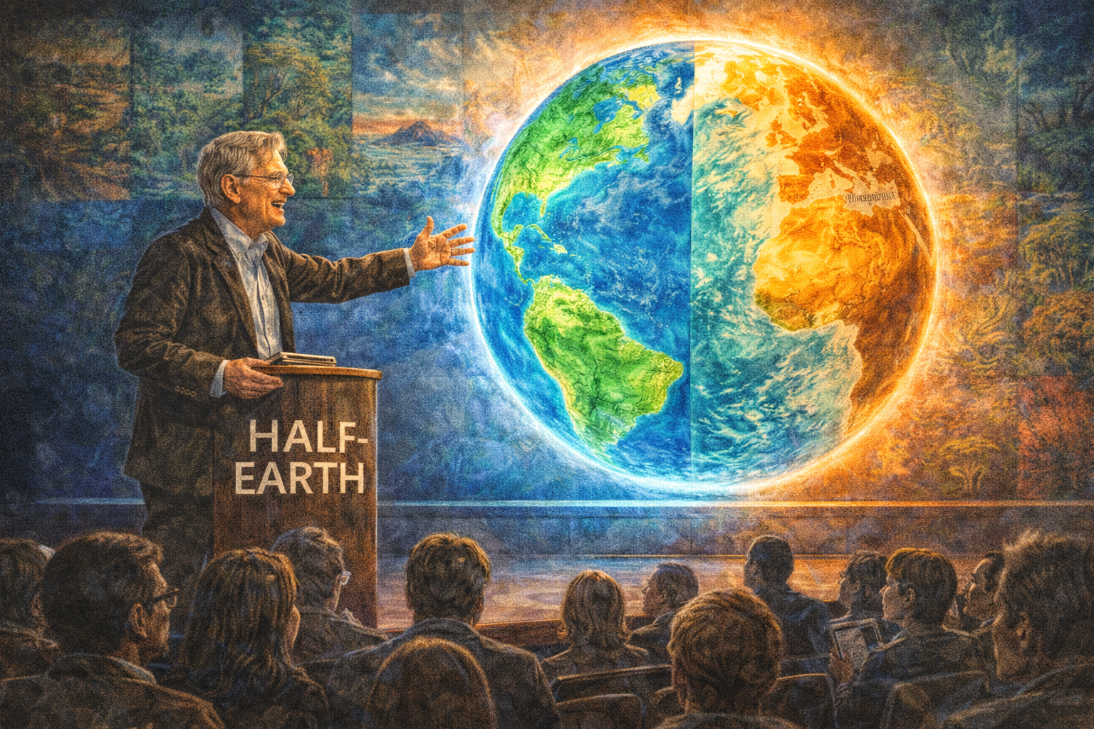 Please generate a 16:9 image in a sweeping, visionary global style — the fullest expression of the biodiversity palette — depicting panel 11 of 12. Make the characters and style consistent with the prior panels. The scene shows Wilson, now in his mid-80s, silver-haired and slightly stooped but still radiating fierce energy, standing before a massive illuminated globe — either a physical model or a projection — that shows his Half-Earth vision. Exactly half of the globe's land and ocean surface is shaded in vibrant green and blue, representing protected areas. The other half shows human-modified landscapes in warm amber and brown. Wilson reaches toward the globe with one hand, as if offering it to the viewer. The setting is a modern conference stage or TED-talk-style platform, with a large audience visible in silhouette. Behind the globe, a mosaic of ecosystems is faintly visible: rainforest, coral reef, tundra, savanna, deep ocean, mangrove, wetland. Color palette: vivid protected-area greens and ocean blues covering half the globe, warm amber and brown for human landscapes, stage lighting in cool blue and warm gold, the globe luminous at center. Emotional tone: audacious hope, the biggest conservation proposal in history. Specific details: (1) Wilson reaching toward the Half-Earth globe with passion, (2) the globe clearly showing 50% protected in green and blue, (3) ecosystem mosaic faintly visible behind the globe, (4) the modern stage setting with dramatic lighting, (5) the audience in silhouette — a mix of young and old, (6) the words "HALF-EARTH" visible on the screen or stage backdrop. Generate the image immediately without asking clarifying questions.Wilson's most audacious idea came near the end of his life. In 2016, at the age of eighty-six, he published Half-Earth: Our Planet's Fight for Life. The proposal was breathtaking in its simplicity and its ambition: protect half the surface of the Earth — land and ocean — and you save approximately eighty-five percent of all species. Anything less, and the extinction cascade continues until the biosphere is impoverished beyond recognition. It was not a guess. It was island biogeography applied to the entire planet — the same species-area relationship he and MacArthur had worked out on mangrove islands in the Florida Keys, scaled up to the globe. Critics called it unrealistic. Wilson called it necessary. "We are needlessly turning the Earth into a permanent desert," he wrote. "Half-Earth is the goal, but it is how we get there — and the way we will be changed by the effort — that counts."