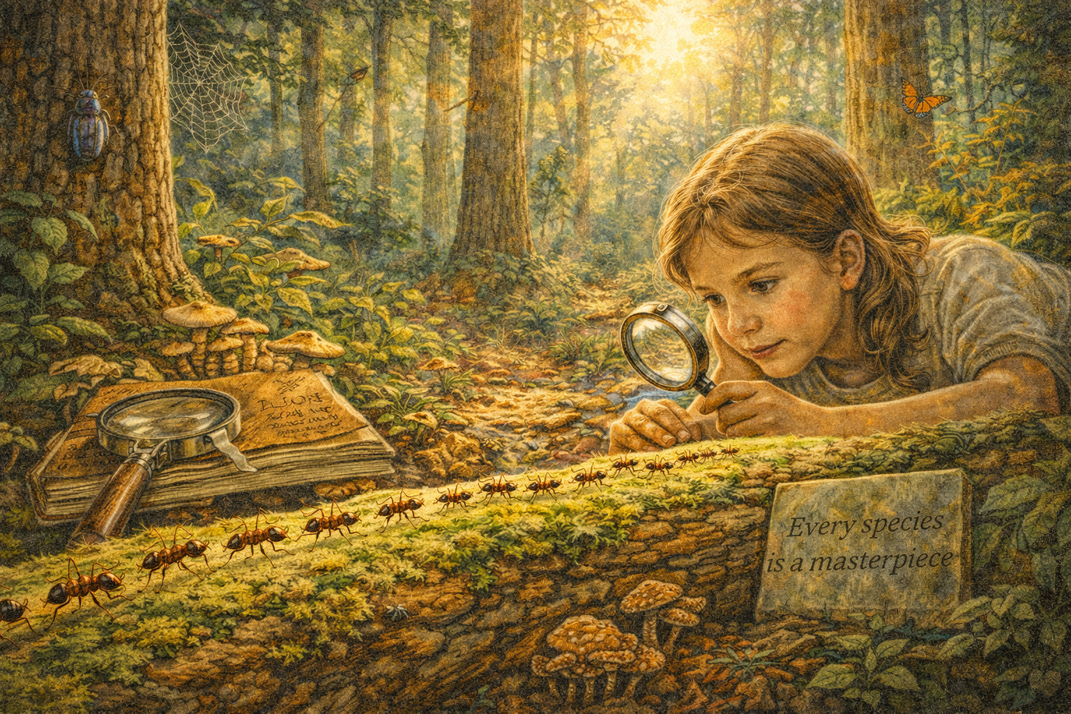 Please generate a 16:9 image in a luminous, elegiac naturalist style that unifies all the visual themes of the previous panels — depicting panel 12 of 12. Make the characters and style consistent with the prior panels. The scene shows a sunlit forest floor — it could be Alabama longleaf pine forest or tropical rainforest; the trees are majestic and ancient. Wilson is not physically present, but his presence pervades the image. In the foreground, a column of ants — the same species from Panel 1 — marches across a mossy log in perfect formation. Beside the log, a magnifying glass rests on a weathered field notebook, as if Wilson has just set them down and stepped away. A young girl, about the same age as Wilson in Panel 1, lies on her belly on the forest floor, her face inches from the ant column, studying them with the same intensity that defined Wilson's boyhood. She holds a modern hand lens. The forest around them is alive: beetles on bark, butterflies in shafts of light, a spider web jeweled with dew, fungi on a fallen trunk, birdsong implied by small birds in the canopy. Color palette: the full spectrum — warm Alabama golds and reds of the soil, lush tropical greens of the canopy, soft morning light, the iridescent detail of insects, the golden patina of the old field notebook. Emotional tone: continuity, reverence, the endless fascination of the living world. Specific details: (1) the ant column crossing the mossy log, echoing Panel 1, (2) Wilson's magnifying glass and field notebook resting on the log, (3) the young girl studying the ants with intense focus, (4) the diverse forest teeming with life at every scale, (5) a small plaque or carved text on a nearby stone reading "Every species is a masterpiece," (6) morning light filtering through the canopy like a cathedral. Generate the image immediately without asking clarifying questions.Edward Osborne Wilson died on December 26, 2021, at the age of ninety-two. He had published over four hundred scientific papers, written more than thirty books, won two Pulitzer Prizes, discovered hundreds of ant species, co-created the theory of island biogeography, ignited and survived the sociobiology wars, coined the word that gave conservation its rallying cry, and proposed the most ambitious plan to save life on Earth ever put forward by a single scientist. But the throughline of his life was simpler than any of that. A boy lost the sight in one eye and learned to look at what was right in front of him. He looked at ants. He fell in love. And that love — patient, obsessive, precise, overflowing — expanded outward from a single colony in Alabama to encompass every living thing on the planet. Wilson proved that you do not have to start with the big picture. You can start with a single ant on a single log, and if you pay close enough attention, it will lead you to the whole world.