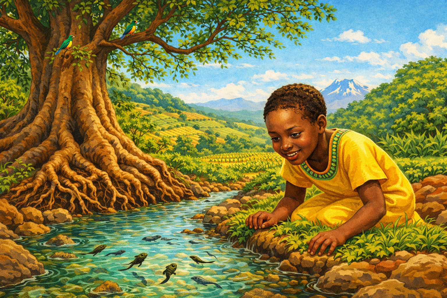 I am about to ask you to generate a series of images for a graphic novel. Please make the images have a consistent style and consistent characters. Do not ask any clarifying questions. Just generate the image immediately when asked. Please generate a 16:9 image in vibrant East African illustration style — warm earth tones (terracotta, sienna, coffee brown), lush greens, bright sky blues, with kikoy textile patterns as accents — depicting panel 1 of 12. The scene shows young Wangari Maathai, around age 8, a bright-eyed Kikuyu girl with close-cropped hair, kneeling beside a clear stream in the central highlands of Kenya in the late 1940s. She watches tadpoles in the water with fascination. A massive sacred fig tree (*mũgumo*) towers behind her, its roots holding the stream bank. The landscape is lush — green hills, terraced farms in the distance, birdsong implied by small colorful sunbirds perched in the fig branches. Color palette: deep emerald green, rich brown soil, clear turquoise stream water, bright blue sky, golden sunlight. Emotional tone: childhood wonder and abundance. Specific details: (1) young Wangari's curious, joyful expression as she peers into the water, (2) the enormous gnarled roots of the fig tree gripping the bank, (3) tadpoles and small fish visible in the clear stream, (4) iridescent sunbirds in the fig canopy, (5) a small farm with maize and beans on the hillside behind, (6) Mount Kenya's snow-capped peak visible in the far distance through morning mist. Generate the image immediately without asking clarifying questions.Little Wangari grew up in Ihithe village in the Nyeri district, where the streams ran so clear you could count the stones on the bottom. She fetched water for her mother and played among the roots of the great fig trees that lined every watercourse. The elders told her the mũgumo was sacred — it held the water in the ground and the soil on the hills. She did not yet know the science behind their words. But her body remembered: cool water, dark soil, green shade, and the sound of flowing streams. That memory would change Africa.