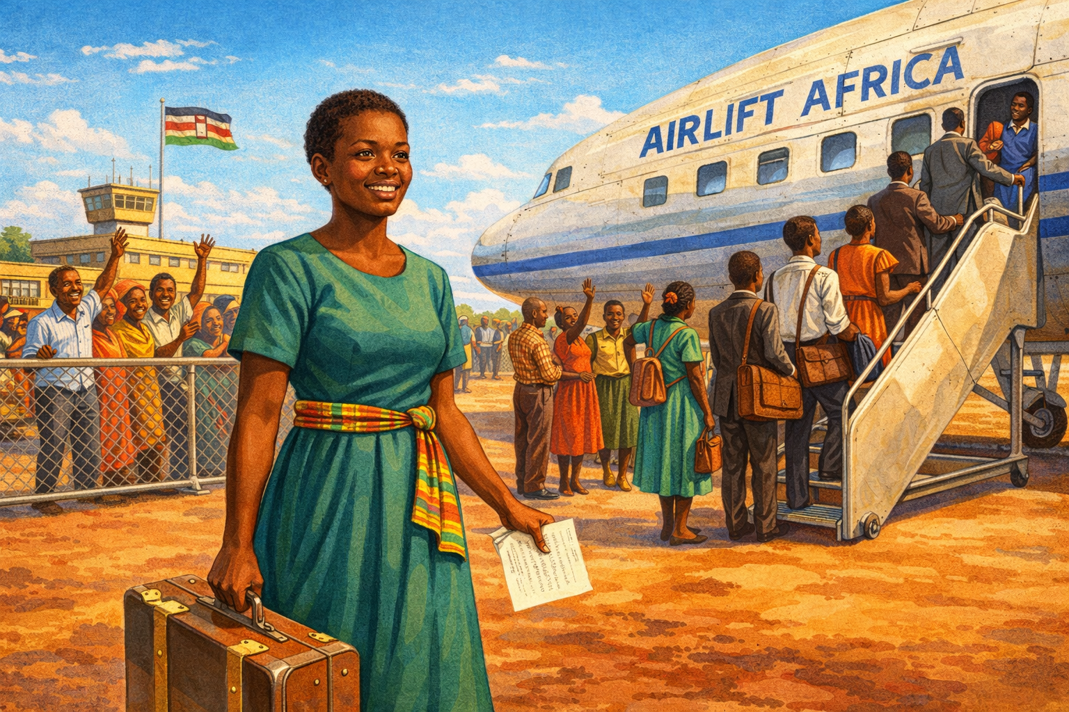 Please generate a 16:9 image in vibrant East African illustration style — warm earth tones, lush greens, bright sky blues, kikoy textile accents — depicting panel 2 of 12. Make the characters and style consistent with the prior panel. The scene shows young Wangari Maathai, now 20, a tall, striking Kenyan woman with high cheekbones and an eager expression, standing on the tarmac at Nairobi airport in 1960, about to board a charter plane with a group of other young Kenyan students. She wears a modest traveling dress and carries a small suitcase. The plane has "AIRLIFT AFRICA" visible on its side. Other students — men and women, excited and nervous — wave goodbye to families behind a fence. Color palette: warm terracotta airport ground, silver airplane, bright blue sky, colorful clothing on the students, golden afternoon light. Emotional tone: hope, excitement, the threshold of possibility. Specific details: (1) Wangari clutching a letter of admission in one hand and her suitcase in the other, (2) the charter plane on the tarmac, (3) families waving behind a chain-link fence, (4) fellow students in a mix of Western and Kenyan dress, (5) the Kenyan flag (newly designed, pre-independence) visible on a terminal building, (6) the wide open sky suggesting the journey ahead. Generate the image immediately without asking clarifying questions.In 1960, Wangari Maathai won a scholarship on the "Kennedy Airlift" — a program that flew hundreds of young East Africans to American universities. She landed at Mount St. Scholastica College in Atchison, Kansas, a world away from Nyeri. She studied biology and saw something that stopped her in her tracks: Americans were planting trees on purpose. Soil conservation was a government program, not a dream. Streams were protected by law. She earned her degree, then a master's in biology at the University of Pittsburgh, and carried a question home with her: If Americans can restore their land, why can't Kenyans?