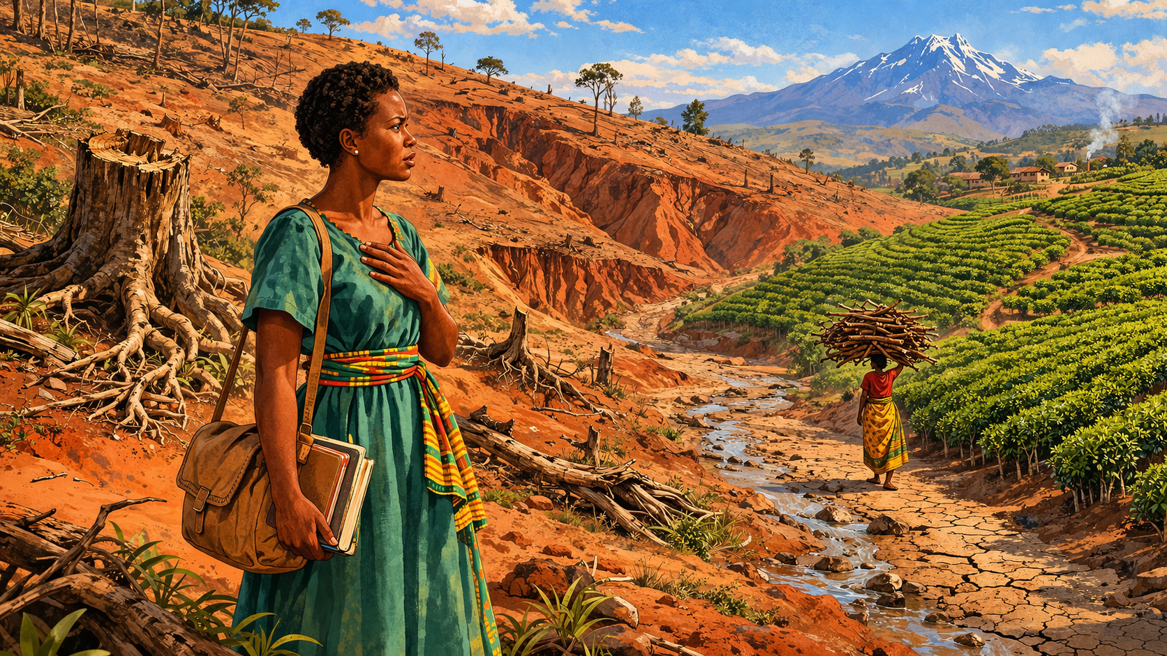 Please generate a 16:9 image in vibrant East African illustration style — warm earth tones, lush greens contrasted with barren browns, bright sky blues, kikoy textile accents — depicting panel 3 of 12. Make the characters and style consistent with the prior panels. The scene shows Wangari Maathai, now around 26, standing on a hillside in the Kenyan central highlands in the late 1960s, staring in shock at the devastation before her. The once-forested slopes are now bare — red, eroded gullies cut through the hillside. Rows of commercial tea bushes cover the lower slopes in monotonous lines. A dry streambed, cracked and empty, runs through the valley where a stream once flowed. A woman in the distance walks with a massive bundle of firewood on her head. Color palette: harsh terracotta and raw sienna for the eroded earth, dull green for the monoculture tea, washed-out blue sky, muted palette conveying loss. Emotional tone: grief and determination. Specific details: (1) Maathai in a simple dress, one hand over her heart in dismay, (2) deep erosion gullies scoring the bare red hillside, (3) rows of commercial tea or coffee replacing native forest, (4) the empty, cracked streambed, (5) a woman carrying firewood in the far distance, (6) a single tree stump where a fig tree once stood, its roots exposed. Generate the image immediately without asking clarifying questions.Maathai returned to Kenya with a PhD — the first East African woman to earn a doctorate — and a heart full of plans. But the land she remembered was gone. The colonial government had replaced native forests with commercial tea and coffee plantations. The post-independence government continued the pattern, handing forest land to political allies. Streams that had run year-round were dry. Women walked miles for firewood and clean water. The soil, without roots to hold it, bled downhill in every rain. Maathai understood what had happened in the language of ecology: remove the trees, and you unravel the entire system — water, soil, food, health, and hope.