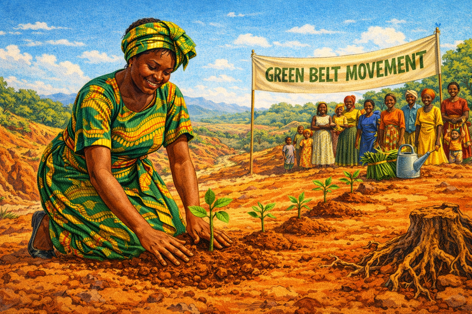 Please generate a 16:9 image in vibrant East African illustration style — warm earth tones, lush greens, bright sky blues, kikoy textile accents — depicting panel 4 of 12. Make the characters and style consistent with the prior panels. The scene shows Wangari Maathai, now 37, kneeling on a bare hillside on June 5, 1977 — World Environment Day — planting a seedling in red Kenyan soil. Six other small seedlings are already planted in a row behind her, each with a small mound of fresh earth. A small crowd of women and children watch from nearby. Maathai wears a bright green and gold African wrap dress and headwrap, her sleeves rolled up, her hands in the soil. A hand-painted banner reads "GREEN BELT MOVEMENT." Color palette: rich red-brown soil, vivid green seedlings, bright fabrics, golden sunlight, blue sky. Emotional tone: humble beginning, quiet revolution. Specific details: (1) Maathai's hands pressing soil around a tiny seedling, (2) six other seedlings already planted in a line, (3) the hand-painted banner, (4) women in colorful dresses watching and smiling, (5) children peeking from behind their mothers, (6) a watering can and a bundle of seedlings wrapped in banana leaves nearby. Generate the image immediately without asking clarifying questions.On June 5, 1977 — World Environment Day — Wangari Maathai planted seven trees in a park in Nairobi. It was not a ceremony anyone noticed. No officials attended. No cameras came. But those seven seedlings were the first act of the Green Belt Movement, and they contained an idea so simple it was revolutionary: ordinary women, paid a small fee for every seedling that survived, could reforest an entire country. Maathai did not wait for government funding or international grants. She started with what she had — seeds, soil, and the knowledge that trees hold everything together.