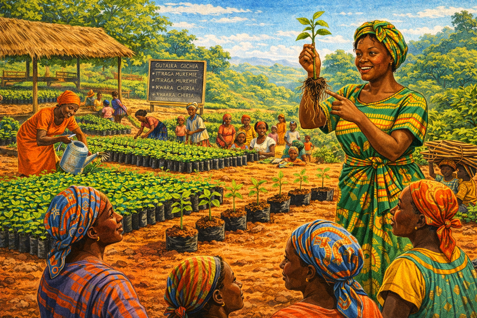 Please generate a 16:9 image in vibrant East African illustration style — warm earth tones, lush greens, bright sky blues, kikoy textile accents — depicting panel 5 of 12. Make the characters and style consistent with the prior panels. The scene shows a thriving open-air tree nursery in rural Kenya in the early 1980s. Dozens of women in brightly colored dresses and headwraps tend rows of seedlings in polythene tubes arranged on raised beds. Wangari Maathai, now in her early 40s, stands among them teaching, holding up a seedling and pointing to its roots while the women listen intently. The nursery is on a gentle slope with a thatched shelter for shade. Color palette: vivid greens of thousands of seedlings, rich earth browns, bright kikoy colors on the women's clothing, warm golden light. Emotional tone: joy, community, purpose. Specific details: (1) Maathai holding a seedling and explaining root structure, (2) hundreds of seedlings in black polythene tubes, (3) women of various ages smiling and working, (4) a woman watering seedlings with a tin can, (5) a simple chalkboard with tree-planting instructions in Kikuyu, (6) children helping to sort seedlings nearby. Generate the image immediately without asking clarifying questions.The idea spread like roots through soil. Maathai trained rural women to collect seeds from native trees, grow them in simple nurseries, and plant them on deforested hillsides. For every tree that survived three months, the women earned a small payment — often their first independent income. The genius was in the design: the women were not charity recipients but foresters, nursery managers, and small business owners. They learned to identify native species, prepare soil, and monitor survival rates. Within a few years, thousands of women across Kenya were running Green Belt nurseries, and the seedling count was climbing toward the millions.
