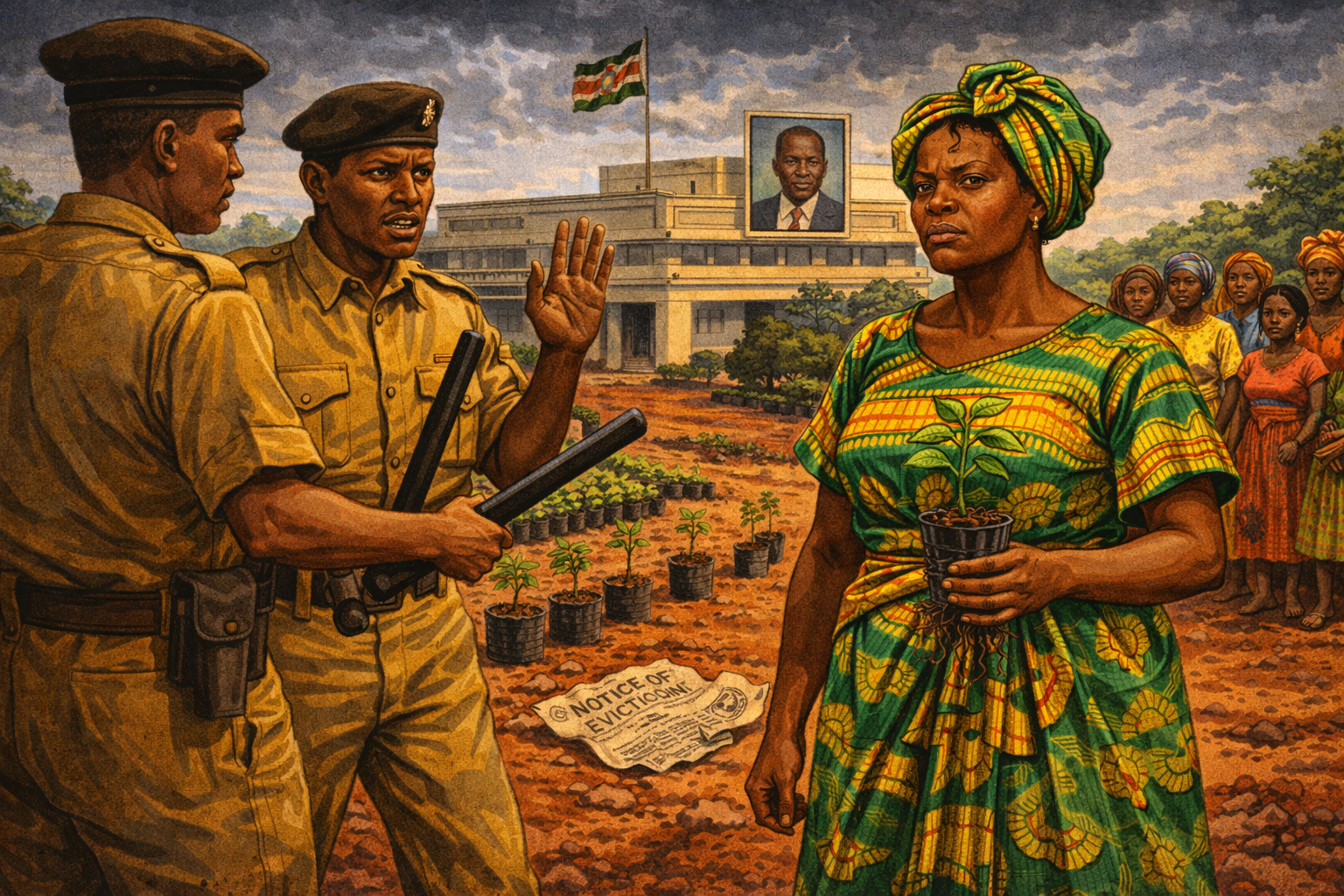 Please generate a 16:9 image in vibrant East African illustration style — warm earth tones, but darker and more ominous — depicting panel 6 of 12. Make the characters and style consistent with the prior panels. The scene shows Wangari Maathai, now in her late 40s, being confronted by Kenyan government police on a Nairobi street in the late 1980s. Two officers in khaki uniforms block her path. Behind them, a government building displays a portrait of President Daniel arap Moi. Maathai stands tall and defiant, wearing a bright green headwrap, her jaw set, her eyes fierce. Supporters — mostly women — watch from behind, some frightened, some angry. Color palette: muted grays and harsh khaki for the authorities, contrasted with Maathai's vivid green and gold clothing, stormy sky, red soil. Emotional tone: intimidation meeting unbreakable resolve. Specific details: (1) Maathai's defiant stance and direct gaze, (2) the police officers with batons, (3) the portrait of Moi on the government building, (4) women supporters clustered behind Maathai, (5) a crumpled government notice on the ground — an eviction or ban order, (6) a single small seedling in a pot that Maathai carries in one hand, refusing to put it down. Generate the image immediately without asking clarifying questions.President Daniel arap Moi's government saw Maathai not as a tree-planter but as a threat. A woman who organized rural communities, who gave poor women economic power, who spoke openly about deforestation caused by government corruption — that was dangerous. Officials called her "a crazy woman" and "a threat to the order and security of the country." She was publicly mocked in Parliament. Her marriage was pressured until it collapsed — her husband said she was "too educated, too strong, too successful, too stubborn, and too hard to control." She was beaten by police, arrested, and thrown in jail. She kept planting.