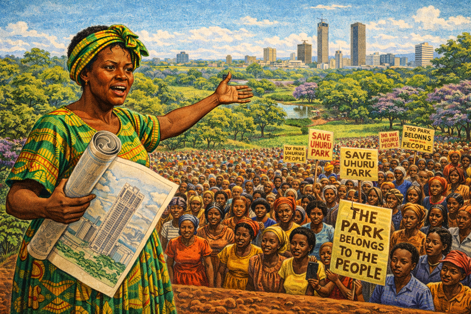 Please generate a 16:9 image in vibrant East African illustration style — warm earth tones, lush greens, bright sky blues, kikoy textile accents — depicting panel 7 of 12. Make the characters and style consistent with the prior panels. The scene shows Wangari Maathai in 1989 standing before a massive crowd in Uhuru Park, Nairobi, giving a passionate speech against the proposed 60-story Kenya Times Media Trust building that would destroy the park. She holds architectural plans rolled up in one hand and gestures with the other toward the green park behind her. The crowd is a mix of women, students, and workers, many holding hand-painted signs reading "SAVE UHURU PARK" and "THE PARK BELONGS TO THE PEOPLE." The Nairobi skyline is visible in the background. Color palette: lush park greens, bright protest signs in red and yellow, warm terracotta tones in the crowd's clothing, blue sky. Emotional tone: righteous defiance and democratic energy. Specific details: (1) Maathai mid-speech with commanding presence, (2) the crowd stretching back into the park, (3) protest signs in English and Swahili, (4) architectural plans visible showing the proposed tower, (5) Nairobi's skyline behind the park, (6) jacaranda trees in purple bloom along the park edge. Generate the image immediately without asking clarifying questions.In 1989, President Moi announced plans to build a sixty-story skyscraper — the tallest in Africa — in the middle of Uhuru Park, Nairobi's most beloved green space. The building would house his political party's media empire. Maathai wrote letters, organized protests, and told the international press that a dictator was stealing the people's park. Moi called her "a mad woman" in Parliament. But foreign investors, embarrassed by the publicity, pulled their funding. The tower was never built. Uhuru Park still stands — Nairobi's green heart — because one woman refused to be silent.