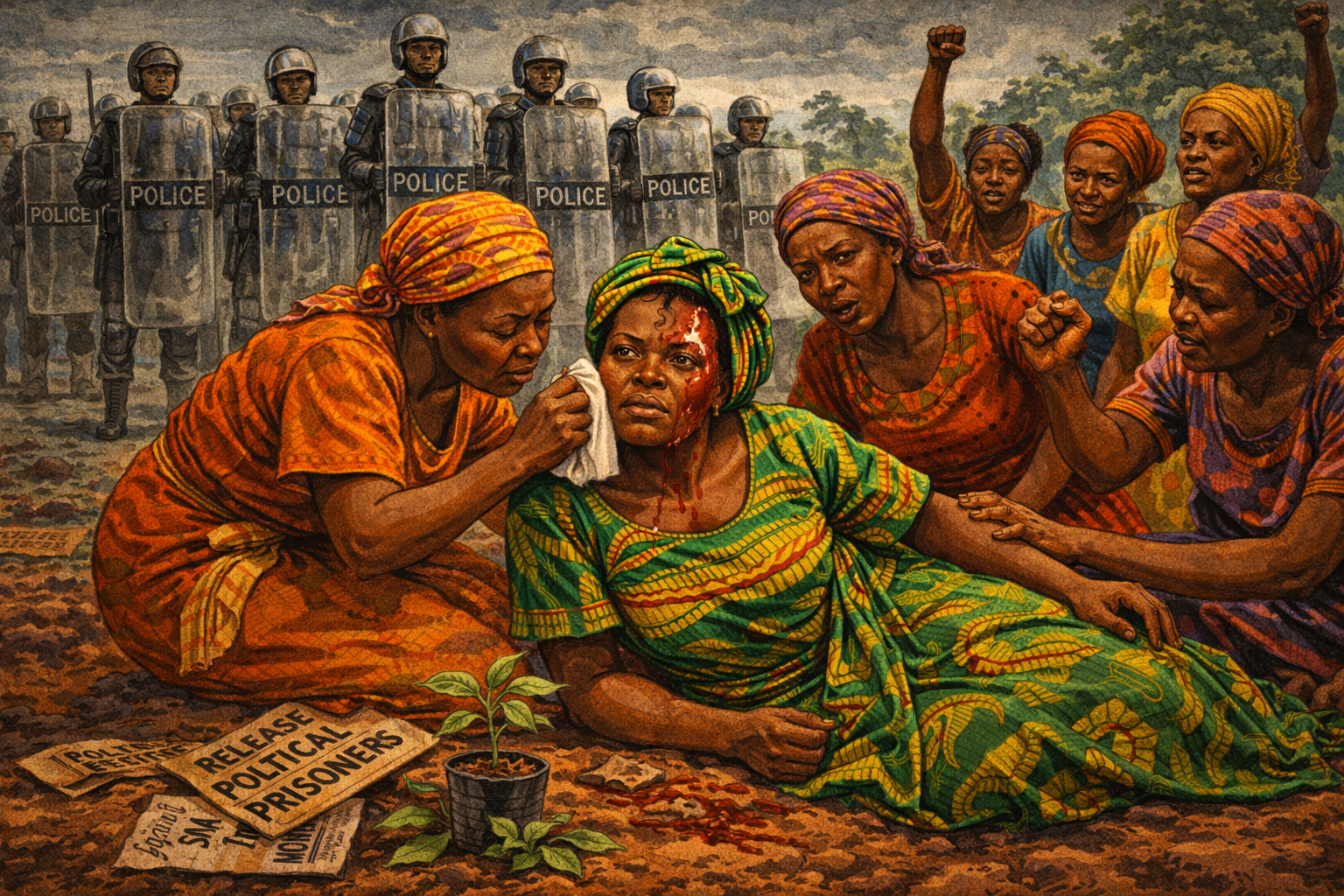 Please generate a 16:9 image in vibrant East African illustration style — warm earth tones darkened for tension, muted palette — depicting panel 8 of 12. Make the characters and style consistent with the prior panels. The scene shows Wangari Maathai in 1992, sitting on the ground in Uhuru Park after being beaten unconscious by police during a hunger strike for the release of political prisoners. Other women — the mothers of the prisoners — surround her, some tending to her injuries, some raising their fists in defiance. Maathai's green headwrap is askew, there is blood on her forehead, but her eyes are open and fierce. Riot police stand in the background with shields. Color palette: somber earth tones, deep shadows, the women's bright clothing standing out against the gray of the police line, a streak of red on Maathai's face. Emotional tone: pain, solidarity, unbroken courage. Specific details: (1) Maathai on the ground, injured but conscious and defiant, (2) women of the "Release Political Prisoners" group around her, (3) one woman pressing a cloth to Maathai's wound, (4) riot police with shields in the background, (5) trampled protest signs on the ground, (6) a single green seedling in a broken pot nearby — symbolism of resilience. Generate the image immediately without asking clarifying questions.The beatings did not stop her. In 1992, Maathai joined the mothers of political prisoners in a hunger strike in Uhuru Park. Police attacked them with clubs and tear gas. Maathai was beaten unconscious. Photographs of her bloodied face went around the world. She lost her university professorship. The government froze her bank accounts. She moved into a tiny apartment and kept organizing. When asked why she did not stop, she answered with a question of her own: "It's the people who are suffering. Should I sit and watch?"