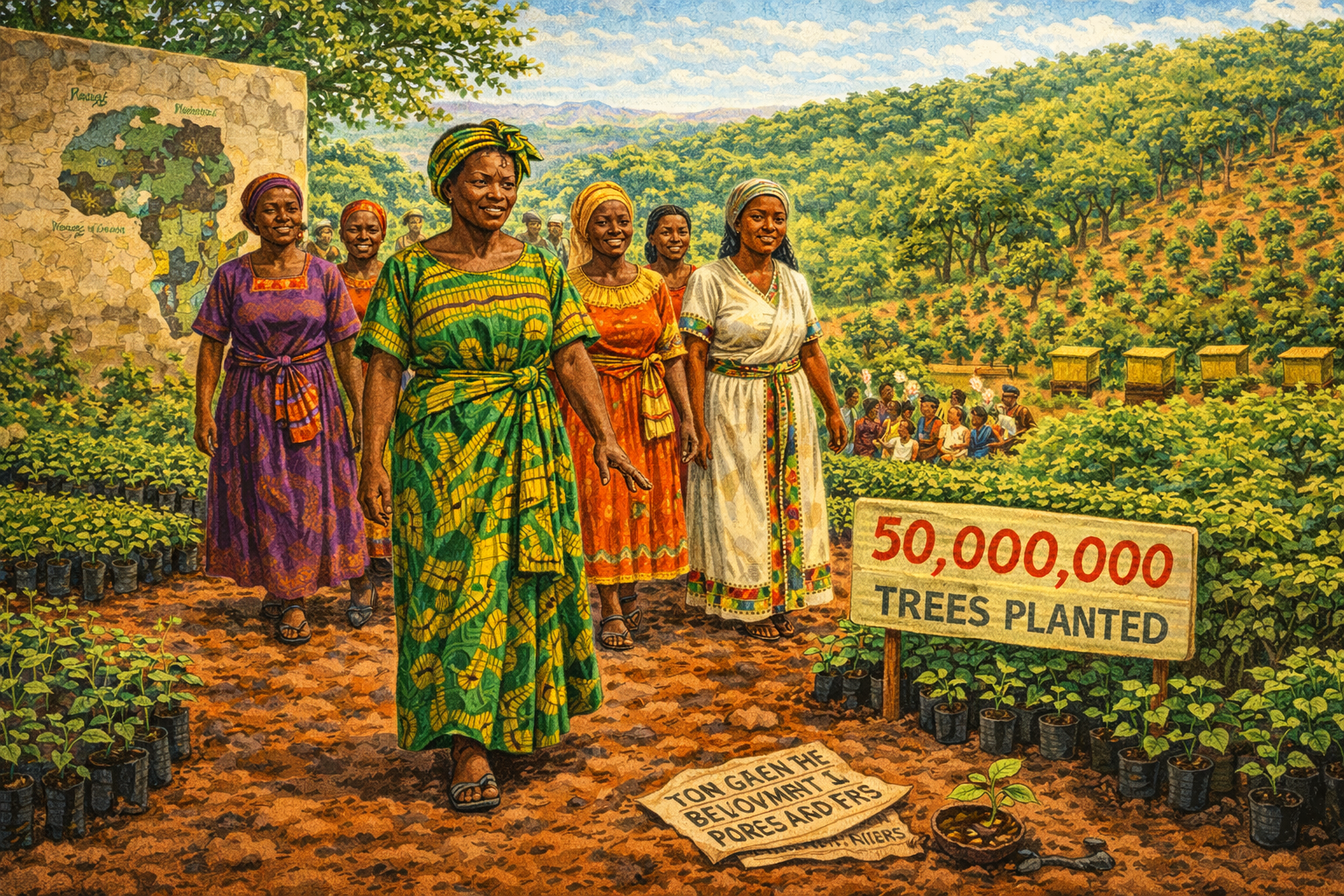 Please generate a 16:9 image in vibrant East African illustration style — warm earth tones, lush greens, bright sky blues, kikoy textile accents — depicting panel 9 of 12. Make the characters and style consistent with the prior panels. The scene shows a wide panoramic view of the Green Belt Movement's impact across East Africa in the late 1990s. In the foreground, Maathai, now in her late 50s with graying temples, walks through a thriving tree nursery with women leaders from multiple African countries — women from Tanzania, Uganda, Ethiopia, and beyond, distinguishable by their varied traditional dress. Behind them, a hillside shows trees at various stages of growth — from seedlings to young forests. A hand-painted sign reads "50,000,000 TREES PLANTED." Color palette: rich spectrum of greens from seedling to canopy, warm earth browns, brilliant kikoy colors on every woman, golden afternoon light. Emotional tone: triumph and continental solidarity. Specific details: (1) Maathai walking confidently with African women leaders, (2) the painted milestone sign, (3) trees at every growth stage on the hillside, (4) a training session visible in the background with women learning nursery skills, (5) beehives placed among the young trees showing diversified livelihoods, (6) a map of Africa painted on a nursery wall showing Green Belt chapters in multiple countries. Generate the image immediately without asking clarifying questions.The Green Belt Movement became something no government could contain. It spread from Kenya to Tanzania, Uganda, Ethiopia, and beyond. By the late 1990s, the numbers were staggering: over fifty million trees planted, more than thirty thousand women trained not just in forestry but in beekeeping, food processing, and civic leadership. The movement had become a school for democracy disguised as a tree-planting program. Women who started by growing seedlings ended up running for local office, managing community water projects, and demanding government accountability. Maathai had understood from the beginning what ecologists know: in a healthy system, everything connects to everything else.