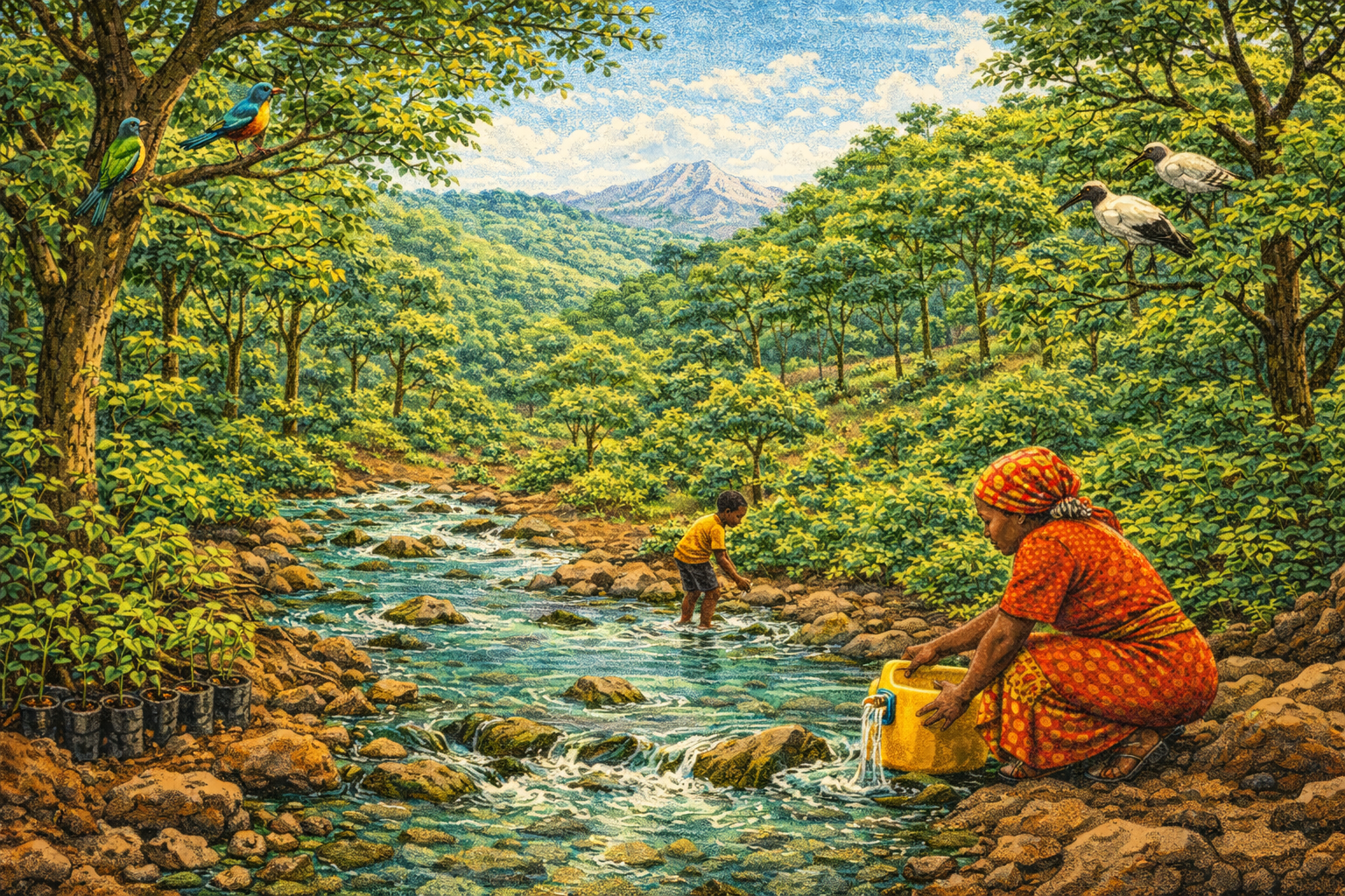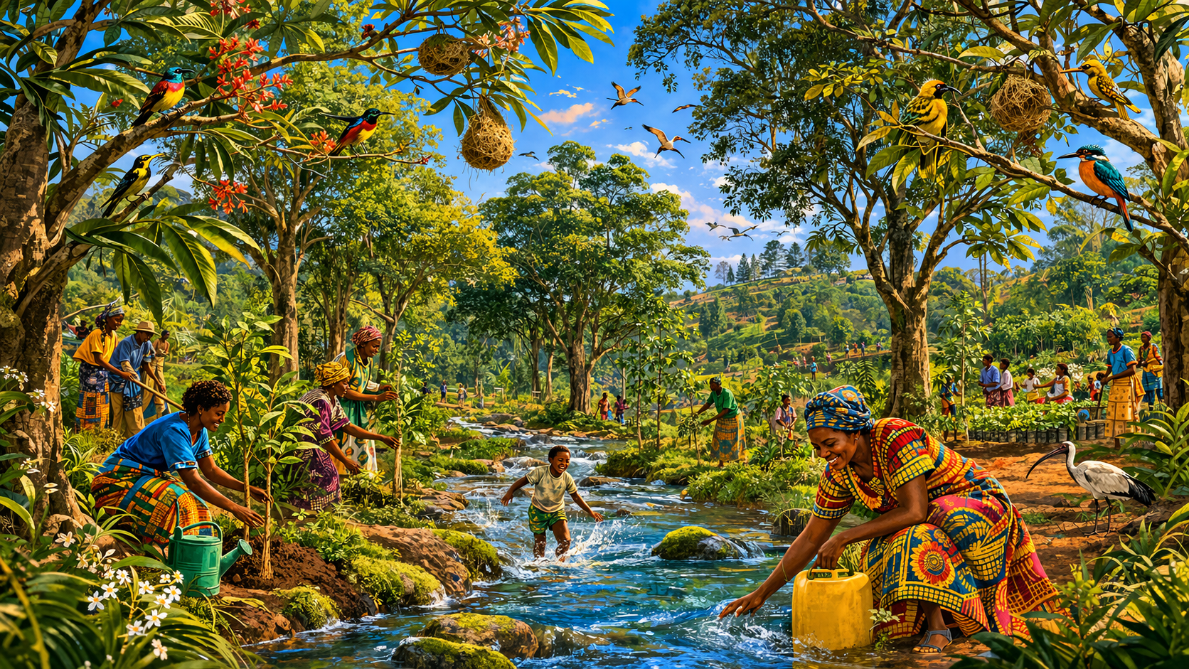 Please generate a 16:9 image in vibrant East African illustration style — warm earth tones, lush greens, bright sky blues, kikoy textile accents — depicting panel 10 of 12. Make the characters and style consistent with the prior panels. The scene shows a restored watershed in the Kenyan central highlands in the early 2000s. A stream that was dry in Panel 3 now flows again — clear water running over mossy stones. Young native trees line both banks, their roots holding the soil. Birds — sunbirds, weavers, and ibis — fill the branches. A woman fills a water container directly from the stream without walking miles. In the background, reforested hillsides show a mosaic of native species. Color palette: rich emerald greens, clear turquoise water, deep brown soil, bright bird plumage, golden dappled sunlight through the canopy. Emotional tone: ecological healing and quiet joy. Specific details: (1) the flowing stream with clear water over stones — echoing Panel 1, (2) native trees lining the restored banks, (3) colorful birds in the canopy, (4) a woman filling a water jug at the stream's edge, (5) healthy dark topsoil visible at the bank where erosion has stopped, (6) a child wading in the stream, playing just as young Wangari once did. Generate the image immediately without asking clarifying questions.And the land healed. In watershed after watershed across Kenya, the pattern was the same: plant native trees, and within a decade the streams begin to flow again. The roots held the soil. The canopy slowed the rain. The leaf litter rebuilt the topsoil. The birds returned, and with them the insects that pollinated the crops. Women who had walked four hours for water now filled their jugs from streams a few minutes from home. This was not magic — it was ecology. Maathai had simply given the land back what had been taken: its native trees, its root networks, its capacity to hold water and life.