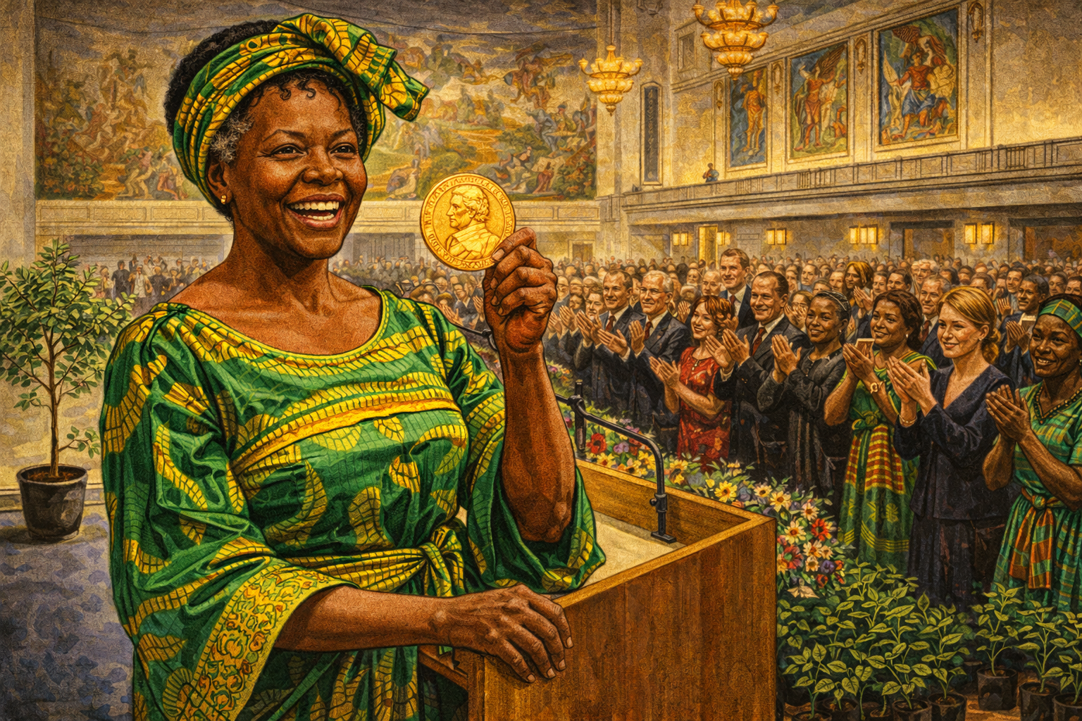 Please generate a 16:9 image in vibrant East African illustration style — warm earth tones, lush greens, bright sky blues, gold accents for the ceremony — depicting panel 11 of 12. Make the characters and style consistent with the prior panels. The scene shows Wangari Maathai at the Nobel Peace Prize ceremony in Oslo, Norway, December 2004. She stands at the podium in a magnificent emerald-green African gown and gold-embroidered headwrap, holding the Nobel medal. She is 64, with distinguished graying hair visible under her headwrap, high cheekbones, and an incandescent smile. The audience — diplomats, royalty, journalists — fills the ornate Oslo City Hall behind her. Color palette: rich emerald green and gold of her dress, warm wood tones of the hall, golden medal, soft chandelier light, cream and burgundy of the formal setting. Emotional tone: historic triumph, global recognition, personal vindication. Specific details: (1) Maathai's radiant smile as she holds the medal, (2) the ornate interior of Oslo City Hall with murals visible, (3) a standing ovation in progress, (4) the Norwegian royals in the front row, (5) a small potted tree on the stage beside the podium — her request, (6) tears visible on the faces of Green Belt women in the audience who traveled from Kenya. Generate the image immediately without asking clarifying questions.On October 8, 2004, the Nobel Committee announced that Wangari Maathai had won the Nobel Peace Prize — the first African woman, and the first environmentalist, to receive the honor. The committee said she had taken "a holistic approach to sustainable development that embraces democracy, human rights, and women's rights in particular." When reporters asked for her reaction, Maathai did not talk about herself. She talked about the trees. "We owe it to ourselves and to the next generation to conserve the environment so that we can bequeath our children a sustainable world," she said. Then she went back to planting.