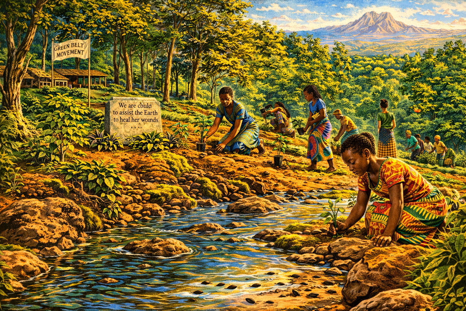 Please generate a 16:9 image in vibrant East African illustration style — warm earth tones, lush greens, bright sky blues, kikoy textile accents — depicting panel 12 of 12. Make the characters and style consistent with the prior panels. The scene shows a sunlit hillside in Kenya in the present day, years after Maathai's death in 2011. A new generation of young Kenyan women — teenagers and young adults — plant seedlings on a hillside, continuing the Green Belt Movement. In the foreground, a young girl kneels beside a stream, watching tadpoles — exactly as young Wangari did in Panel 1, completing the visual circle. A mature native forest rises behind them — the trees that Maathai's generation planted, now tall and thriving. A simple stone marker reads: "We are called to assist the Earth to heal her wounds." Color palette: the full vibrant spectrum — rich greens, warm earth tones, bright sky blue, golden light, colorful clothing — the palette at its most alive. Emotional tone: continuity, hope, living legacy. Specific details: (1) the young girl by the stream echoing Panel 1's composition, (2) young women planting seedlings on the hillside, (3) the mature forest planted by Maathai's generation, (4) the memorial stone with her quote, (5) a Green Belt Movement flag flying from a nursery shelter, (6) Mount Kenya visible in the background under a clear sky, the same mountain from Panel 1 — full circle. Generate the image immediately without asking clarifying questions.Wangari Maathai died on September 25, 2011, at the age of seventy-one. But the Green Belt Movement did not die with her. Today, new generations of women across Africa tend the nurseries, plant the seedlings, and teach the next class of foresters. The trees Maathai planted in the 1970s are now towering canopies sheltering streams that flow year-round. Her life proved something that every ecologist knows but most politicians forget: that the health of the land and the dignity of the people who live on it are the same thing. You cannot restore one without the other. And sometimes the most powerful act of resistance is planting a tree.