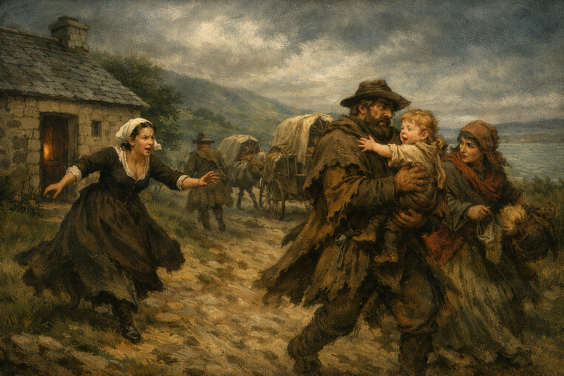 I am about to ask you to generate a series of images for a graphic novel. Please make the images have a consistent style and consistent characters. Do not ask any clarifying questions. Just generate the image immediately when asked to do so. Please generate a 16:9 image in warm Enlightenment-era oil painting style depicting panel 1 of 14. The scene shows a small Scottish coastal village, Kirkcaldy, in 1726. A three-year-old boy with light brown hair is being carried away by a group of traveling people moving along a dirt road, while in the background a stone cottage with a slate roof stands with its door open. A woman in a dark dress — the boy's mother, Margaret Douglas — is running from the cottage toward the road, her face showing panic and determination. The landscape is misty green Scottish hills with the Firth of Forth visible in the distance. The color palette is muted greens, slate grays, and stormy sky blues. The emotional tone is tense and dramatic, but with a sense that rescue is imminent. Generate the image now.Adam Smith's life began with loss and danger. His father, a lawyer and customs official, died months before Adam was born in 1723 in Kirkcaldy, Scotland. At the age of three, young Adam was snatched by a band of traveling people passing through town. His uncle organized a search party and rescued him quickly, but the incident left its mark. Smith's mother, Margaret Douglas, became fiercely protective of her only child — and Adam grew up unusually close to her, a quiet boy who preferred books and observation to rough play.