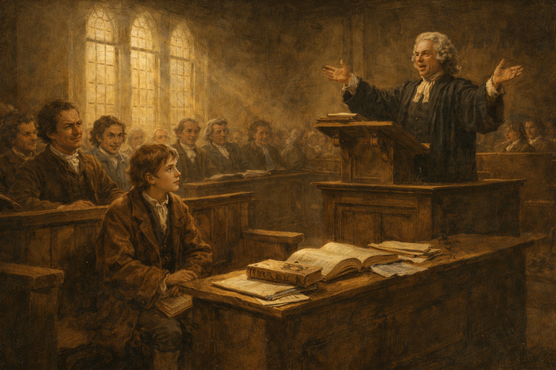 Please generate a 16:9 image in warm Enlightenment-era oil painting style depicting panel 2 of 14. Make the characters and style consistent with the prior panel. The scene shows the interior of a lecture hall at the University of Glasgow, circa 1737. A 14-year-old Adam Smith — thin, gangly, with an oversized coat — sits in a wooden pew surrounded by older students who glance at him with mild amusement. At the front, the philosopher Francis Hutcheson lectures passionately, gesturing broadly, wearing academic robes. Hutcheson's face is animated with enthusiasm. Sunlight streams through tall arched windows, illuminating dust motes. Books and papers are scattered on the wooden desk before Smith. The color palette is warm amber light against dark wood and stone walls. The emotional tone is one of intellectual awakening — the awkward boy is transfixed by the lecture. Generate the image now.At just fourteen, Smith entered the University of Glasgow — young even by 18th-century standards. He was an odd student: shy, prone to fits of abstraction, and known for talking to himself while walking. But he found his intellectual hero in Professor Francis Hutcheson, a charismatic Irish philosopher who lectured in English rather than Latin and paced the room with infectious energy. Hutcheson taught that humans have a natural "moral sense" — an inborn ability to feel the pleasure and pain of others. This idea would become the seed of Smith's entire life's work.