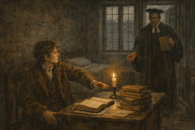 Please generate a 16:9 image in warm Enlightenment-era oil painting style depicting panel 3 of 14. Make the characters and style consistent with the prior panels. The scene shows a young Adam Smith, now around 17, sitting alone in a cold, dimly lit room at Balliol College, Oxford, circa 1740. He is reading David Hume's "A Treatise of Human Nature" by candlelight, hunched over a small desk piled with books. The room is spartan — bare stone walls, a narrow bed, a single window showing gray English rain. A stern-faced college proctor stands in the doorway, having just confiscated the book — Smith's hand reaches toward where the book was. The color palette is cold blues and grays contrasted with the warm golden glow of the single candle. The emotional tone is isolation and quiet rebellion. Generate the image now.Smith won a scholarship to Oxford, but found it a deeply disappointing place. The professors rarely lectured and seemed uninterested in teaching. Left largely to educate himself, Smith devoured books — until the college authorities confiscated his copy of David Hume's Treatise of Human Nature, which they considered dangerously radical. Smith spent six lonely years at Oxford, battling homesickness and what may have been a nervous breakdown. But the solitude forged something important: the habit of thinking deeply and independently, refusing to accept ideas simply because authorities endorsed them.
